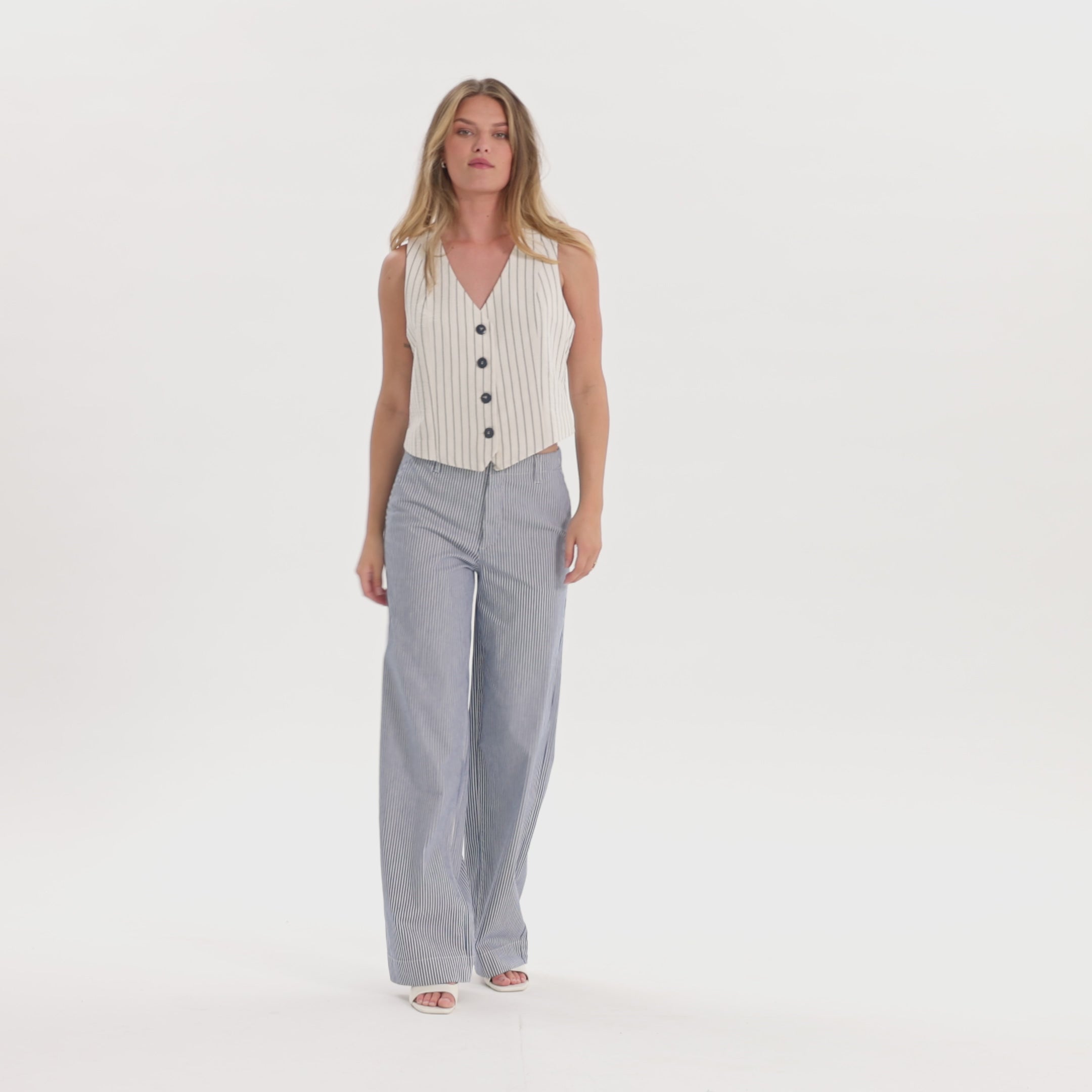 EricaFV har et afslappet og rent udseende og sidder på en opbygget linning med bæltestropper og en lynlås med knaplukning. De er skåret lige i en silhuet med vide ben og har subtile detaljer i form af syninger og påsatte baglommer. Vi anbefaler at gå en størrelse ned.