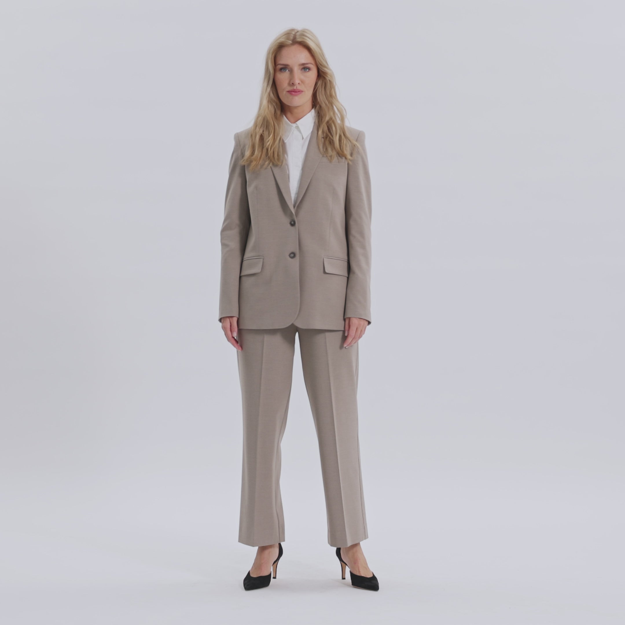 HannahFV er skåret i en straight fit-silhuet med et enkelt bryst og har en blød, skulpturel stil med minimale detaljer som logoknapper, et skåret revers, en funktionel brystlomme og klaplommer foran. Indsnit i siderne og bløde skulderpuder indrammer kroppen, mens en slids i ryggen sikrer bevægelsesfrihed. Designet i København, fremstillet af specialister i Tyrkiet