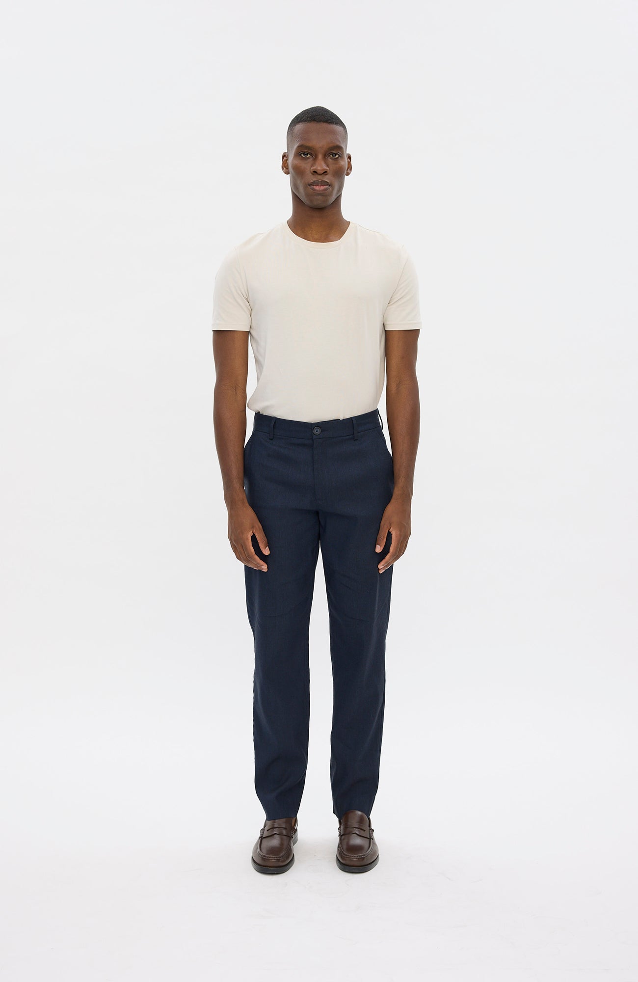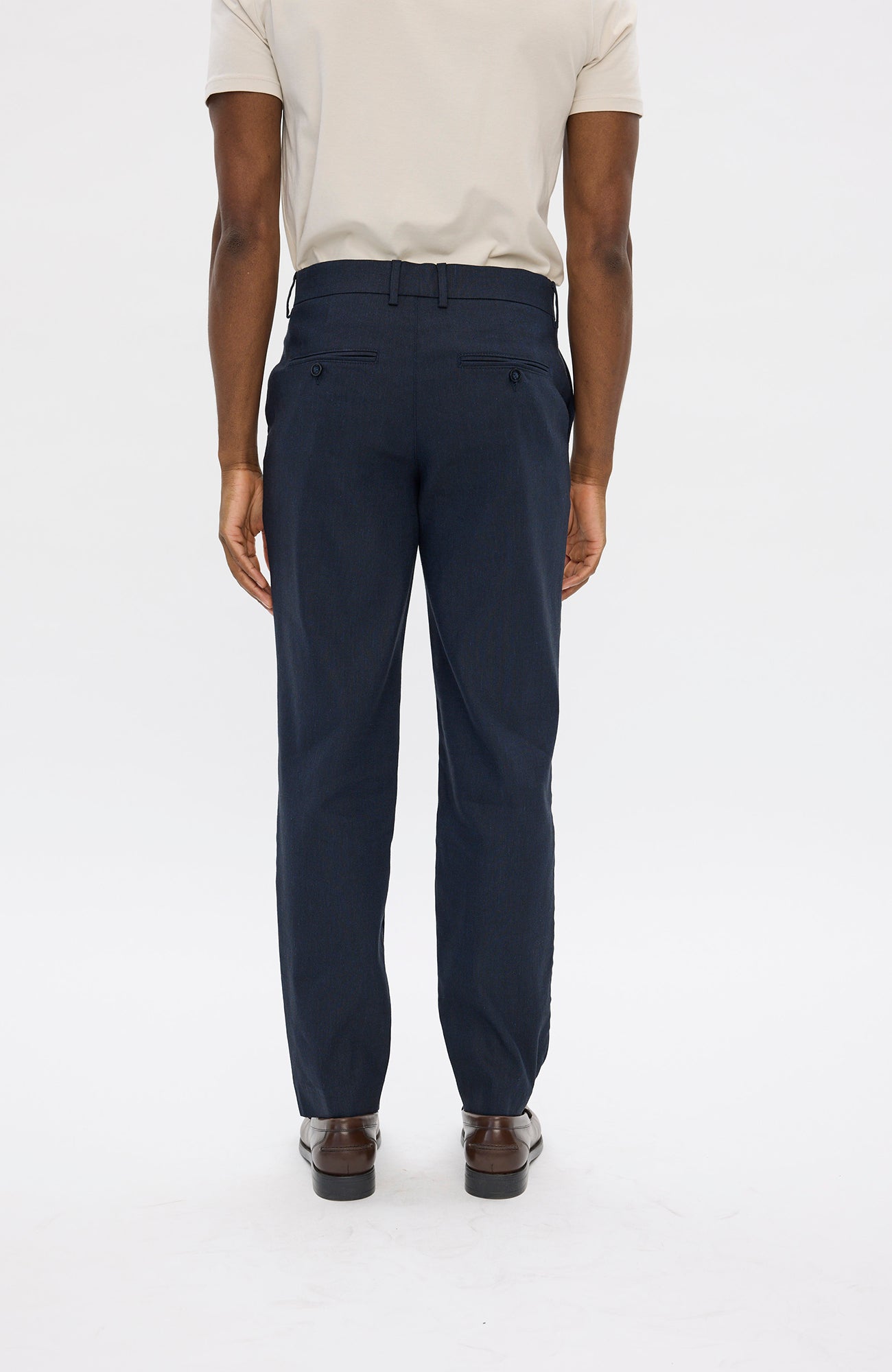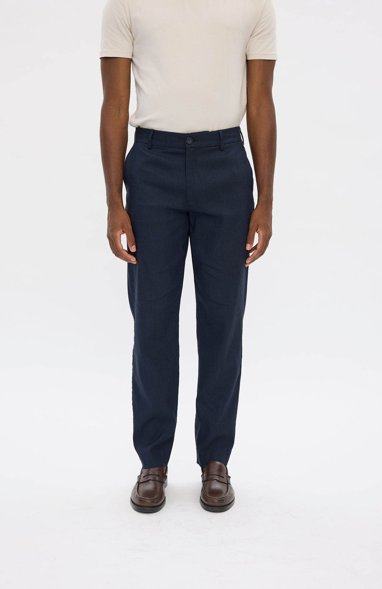 AlvinPL er bukser med lige pasform i et klassisk design. En enkel konstruktion uden unødvendige detaljer understreger deres minimale og holdbare stil. De har to skrå forlommer, to dobbelte paspolerede baglommer, bæltestropper, knaplukning og lynlås i gylpen. Designet i København.