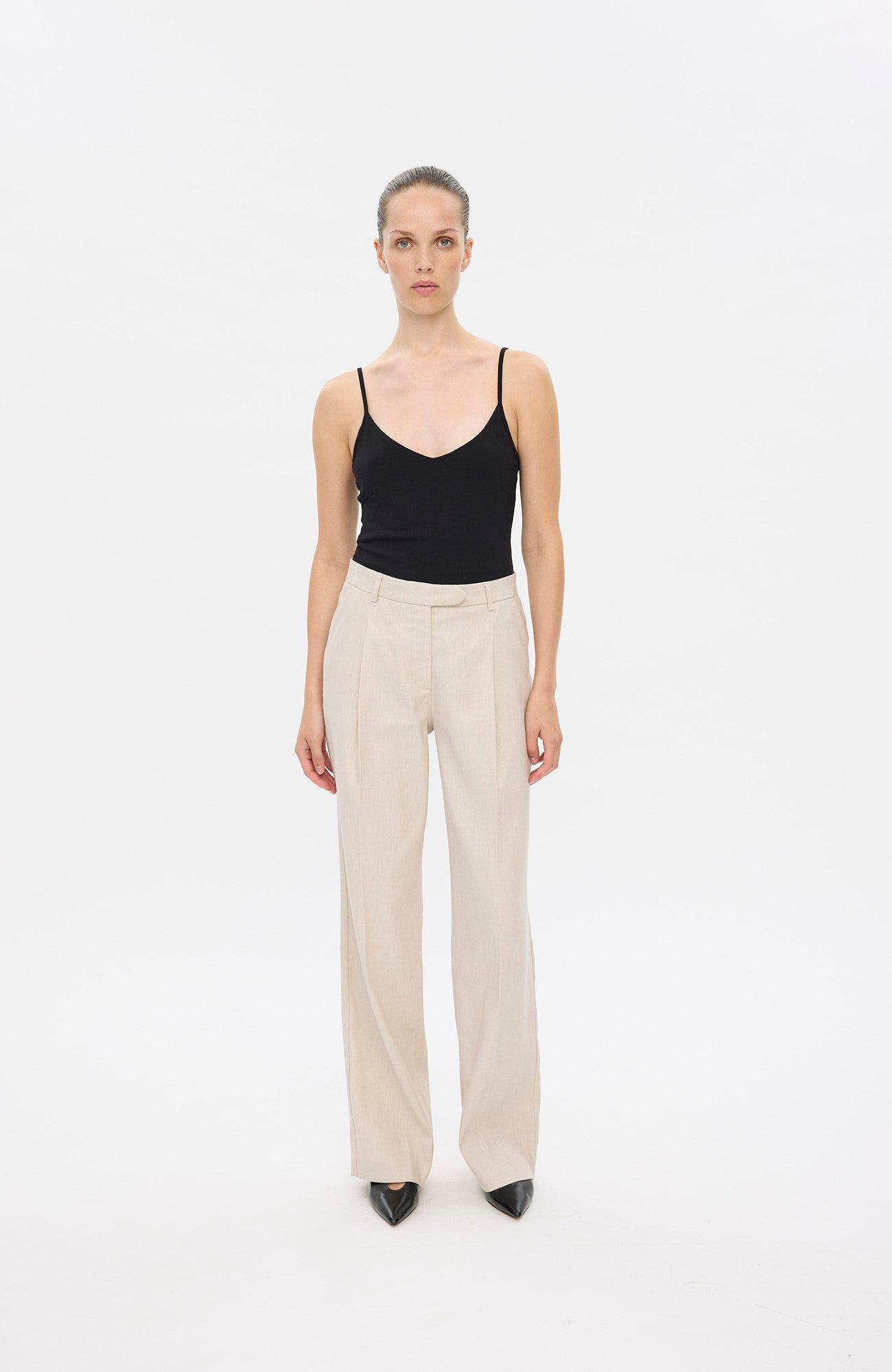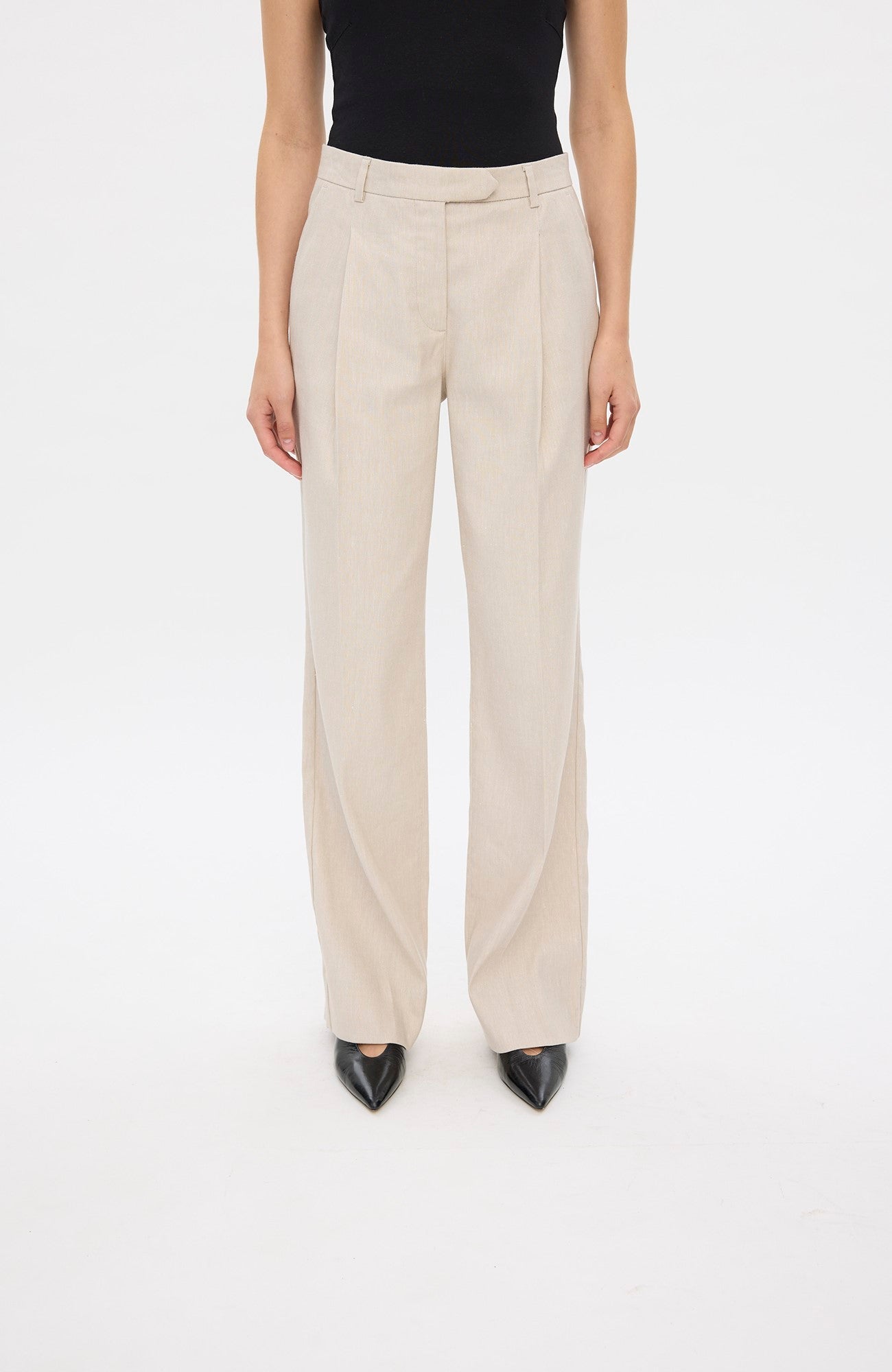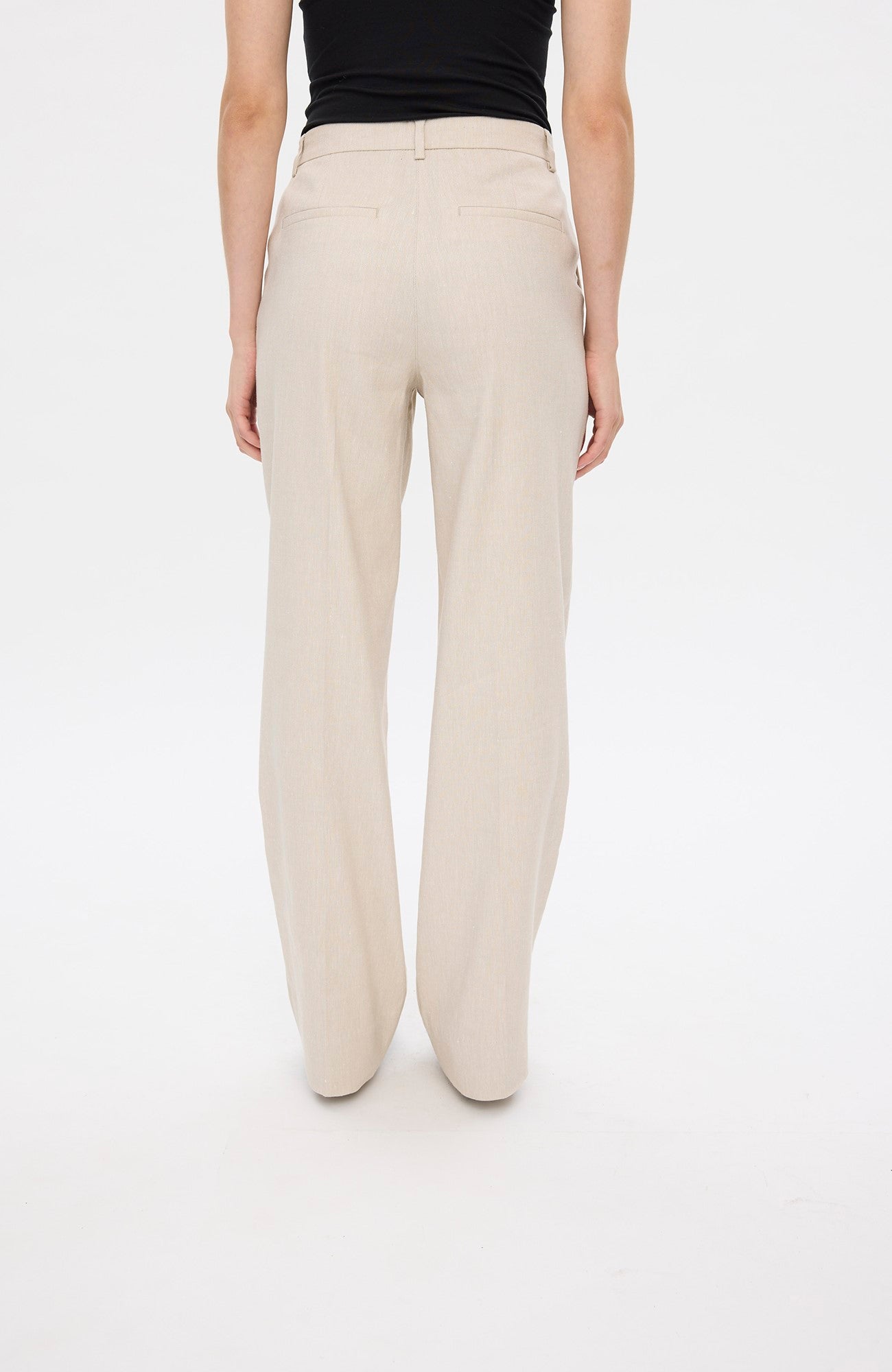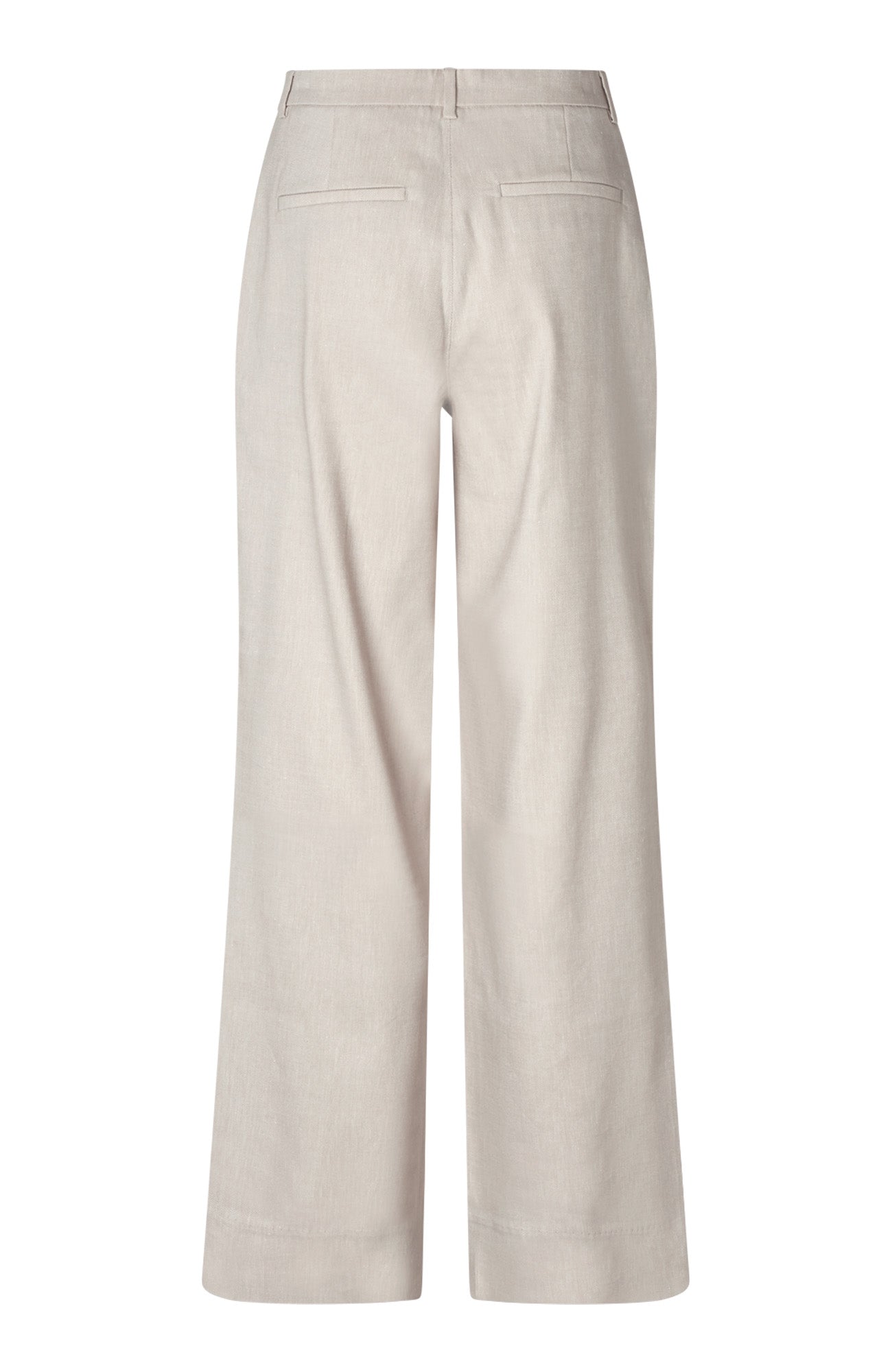ElaineFV er mellemhøje, lange bukser med lige ben og syede læg foran. Inkluderer skrå forlommer, imiterede paspolerede baglommer, lukning med hægte, bæltestropper og skarpe folder. Designet i København.