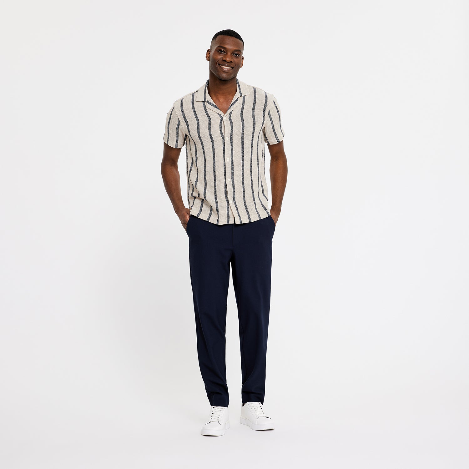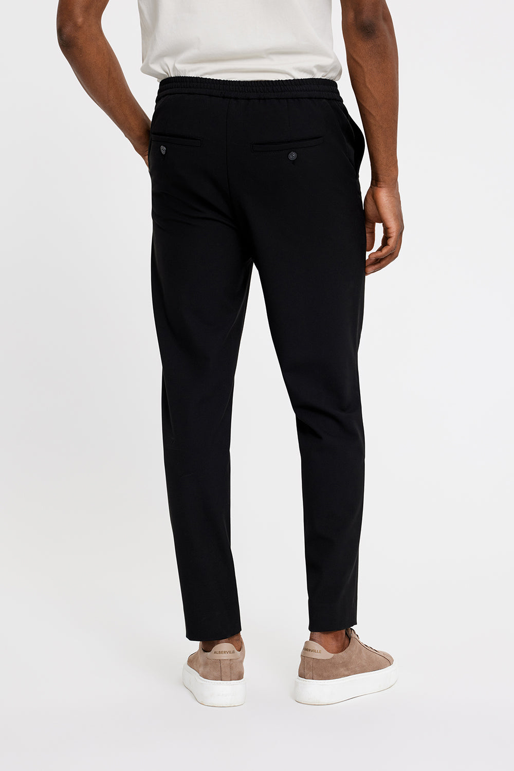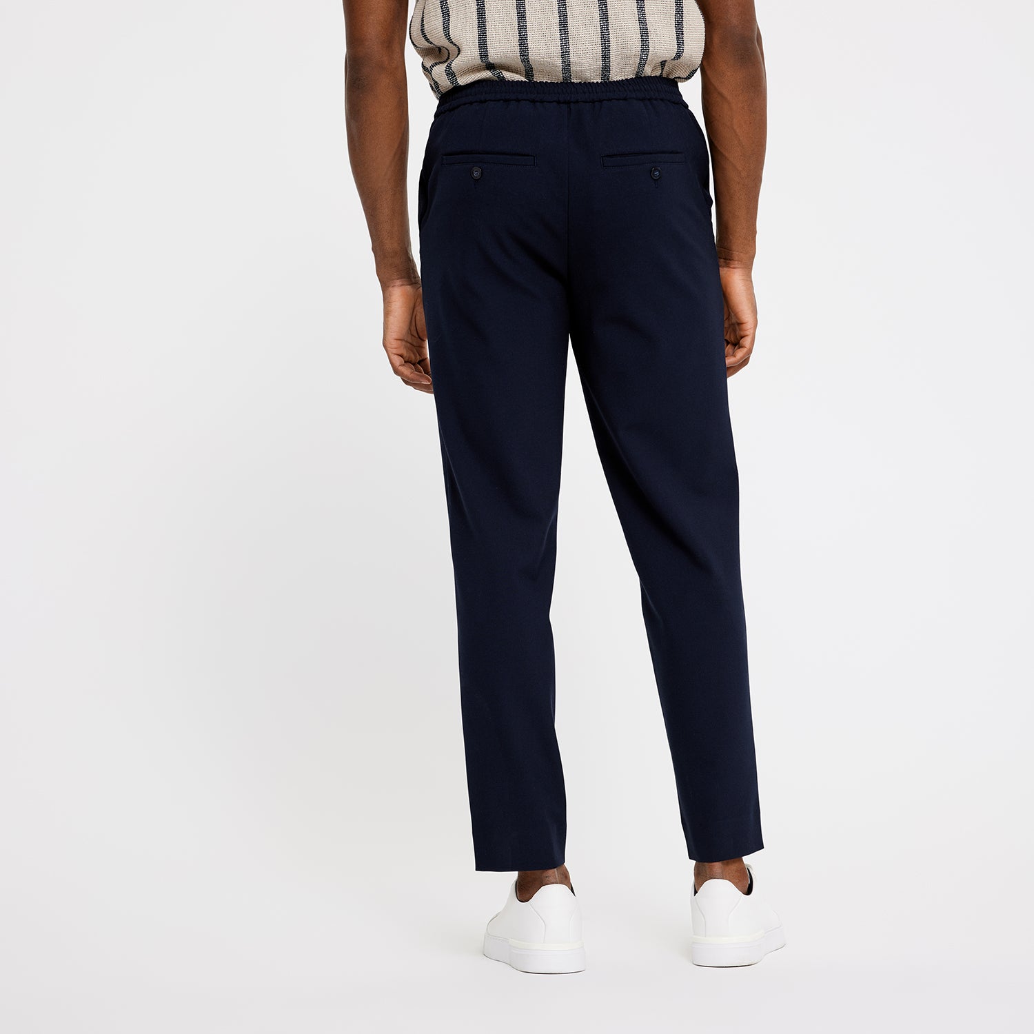 Theo 285 er 'tapered-fit’ bukser lavet af elegant lærredsvævet stof i et klassisk design. For en balance mellem udseende og komfort har de en standard, formel talje foran, en elastisk bånd på bagsiden, to skrå frontlommer og to paspolerede baglommer. Designet i København og lavet af specialister i Tyrkiet.