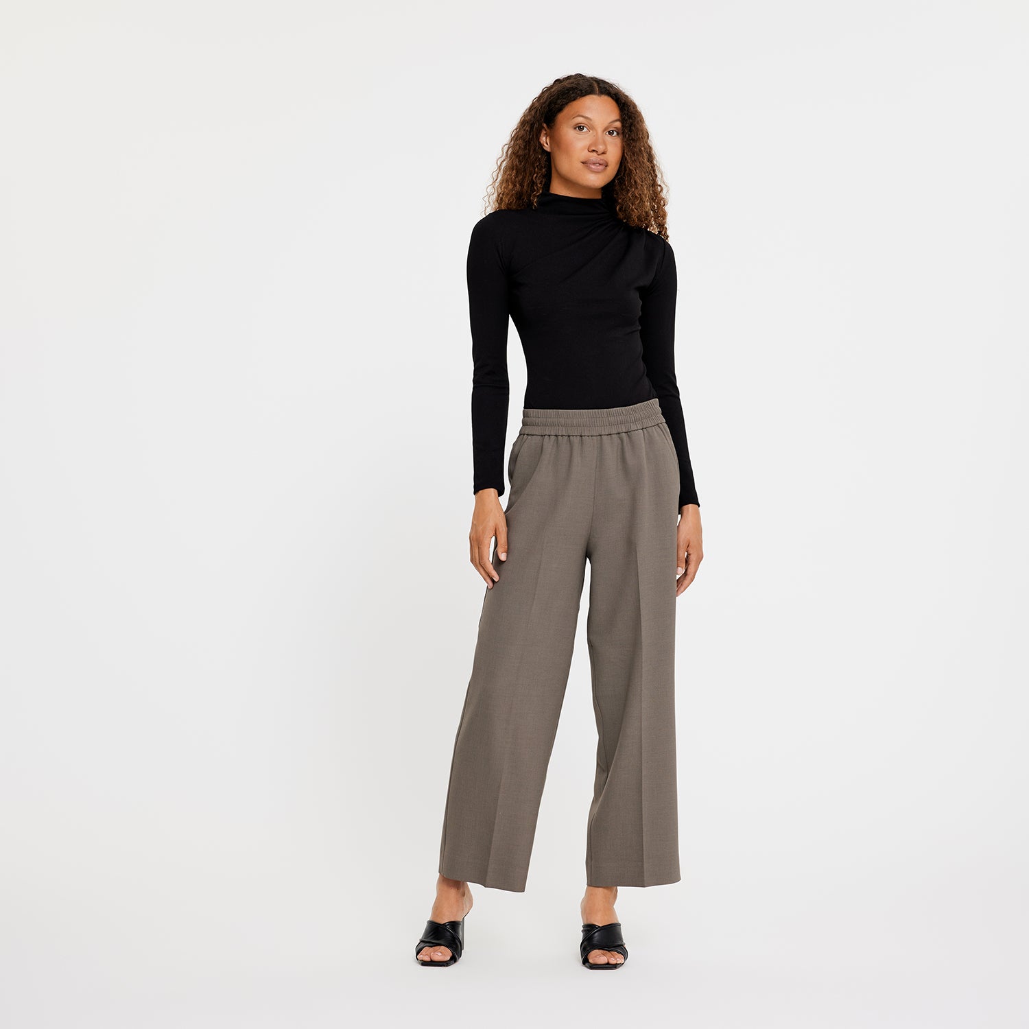 LouiseFV Ankle are wide-straight-fit trousers. Being high-waisted, we shaped them to sit close to your waist, hips, and nothing else. Their beautiful, flowy legs, intended to end at your ankles, are designed with crease lines to give them a formal look. An elastic waistband makes them easy to pull on and wear comfortably throughout the day. Designed in Copenhagen and made by specialists in Turkey.