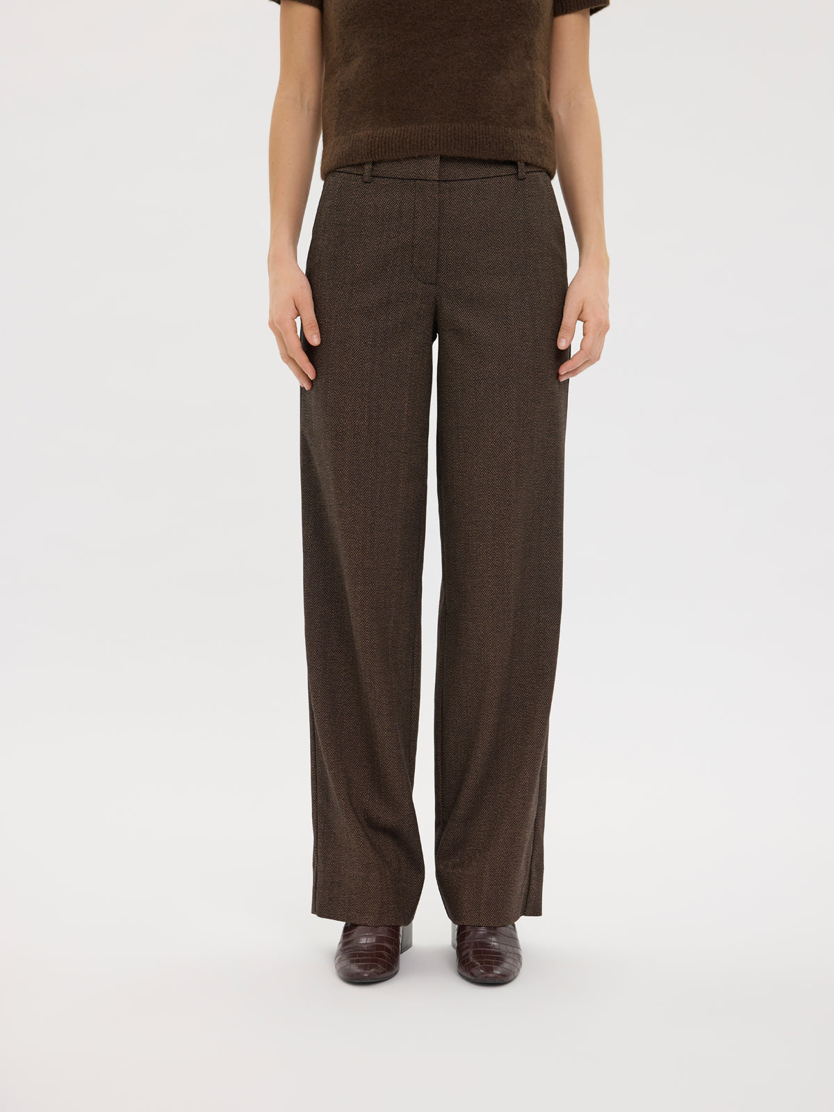 Timeless and versatile, these wide-fit trousers are crafted for all-day comfort and effortless style. Made from a soft mélange fabric with a herringbone weave, they drape fluidly to the floor, embodying understated elegance. With a mid-waist cut designed to accentuate the hips and enhance movement, the expertly shaped waistband follows the body's natural curves, offering both structure and flexibility. Designed in Copenhagen and made by specialists in Turkey.