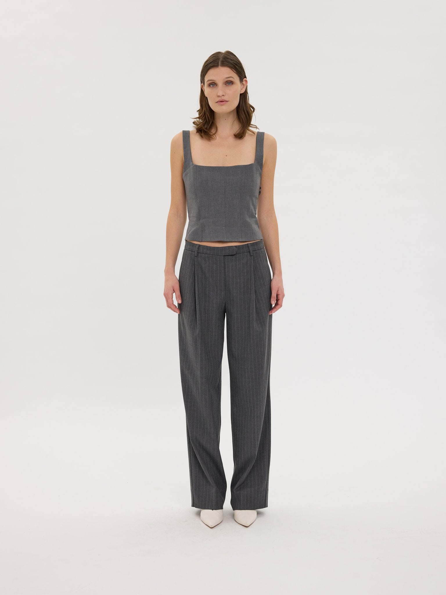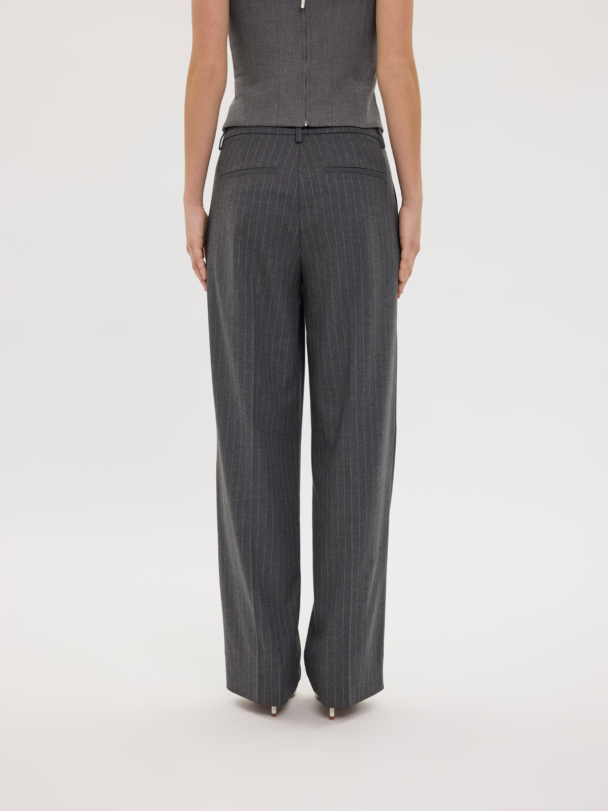 These sophisticated straight-leg trousers are made from heavy twill woven with pinstripes and cut in a wide-leg silhouette. Designed to sit mid-waist, they feature an extended hook and bar closure for a sleek silhouette. Pressed creases and fake back welt pockets add a polished, tailored touch. Designed in Copenhagen and made by specialists in Turkey.