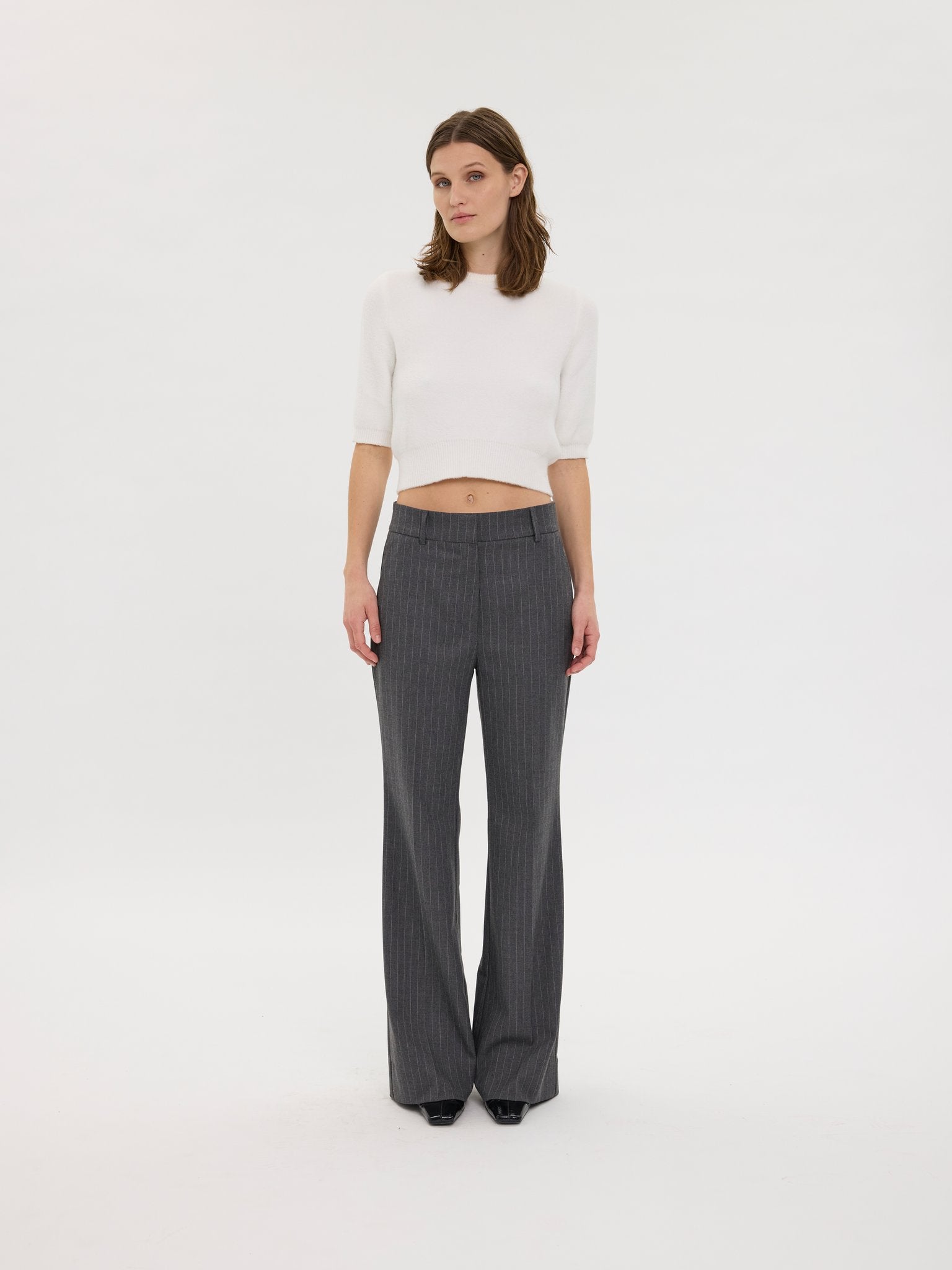 A sophisticated wardrobe staple that pairs effortlessly with everything, this pair of trousers is impeccably tailored for a classic yet versatile look. The high-waisted style is crafted from dense twill-weave fabric with subtle pinstripes. Designed to flatter, they contour the waist, accentuate the hips and thighs and elegantly flare from just above the knee. Defined crease lines and flowing legs enhance their refined silhouette. Designed in Copenhagen and made by specialists in Turkey.