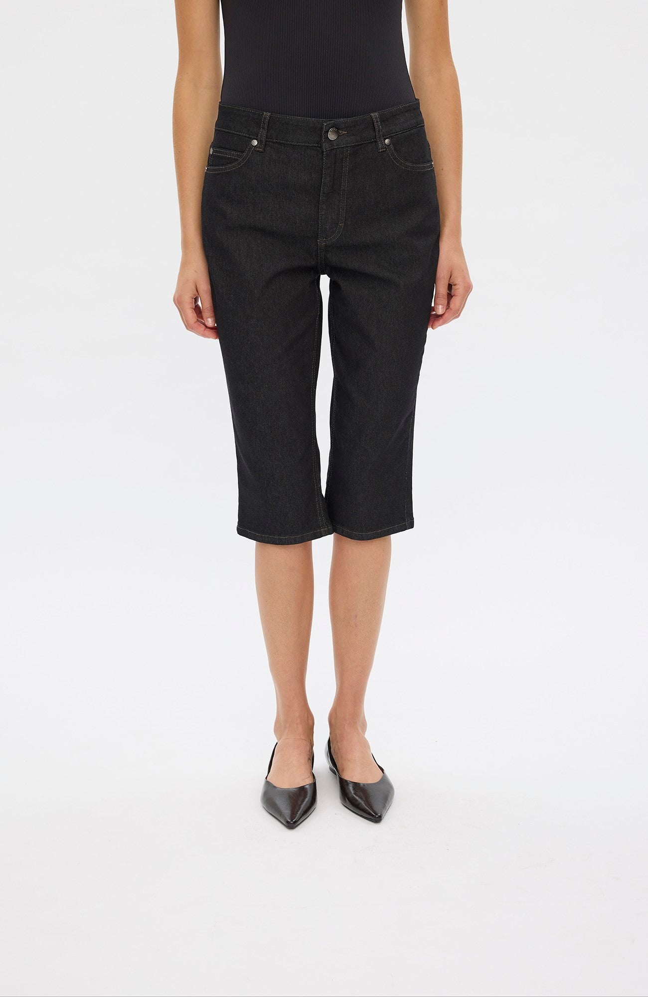 Slim capri trousers with denim-inspired styling. Mid-rise with a tapered, cropped fit. Features button closure with zip fly, belt loops, and rivet detailing. Designed in Copenhagen.