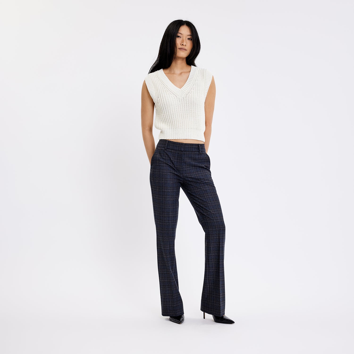 ClaraFV 069 are flared-fit trousers crafted from mid-weight plain-weave fabric in a checkered design. Being mid-waisted, we shaped them to rest on your hips, accentuate your hips and thighs, and flare from your knees down. Creases, outstanding legs and a highly versatile silhouette you can style in more than one way underline their exquisite look. Designed in Copenhagen and made by specialists in Turkey.