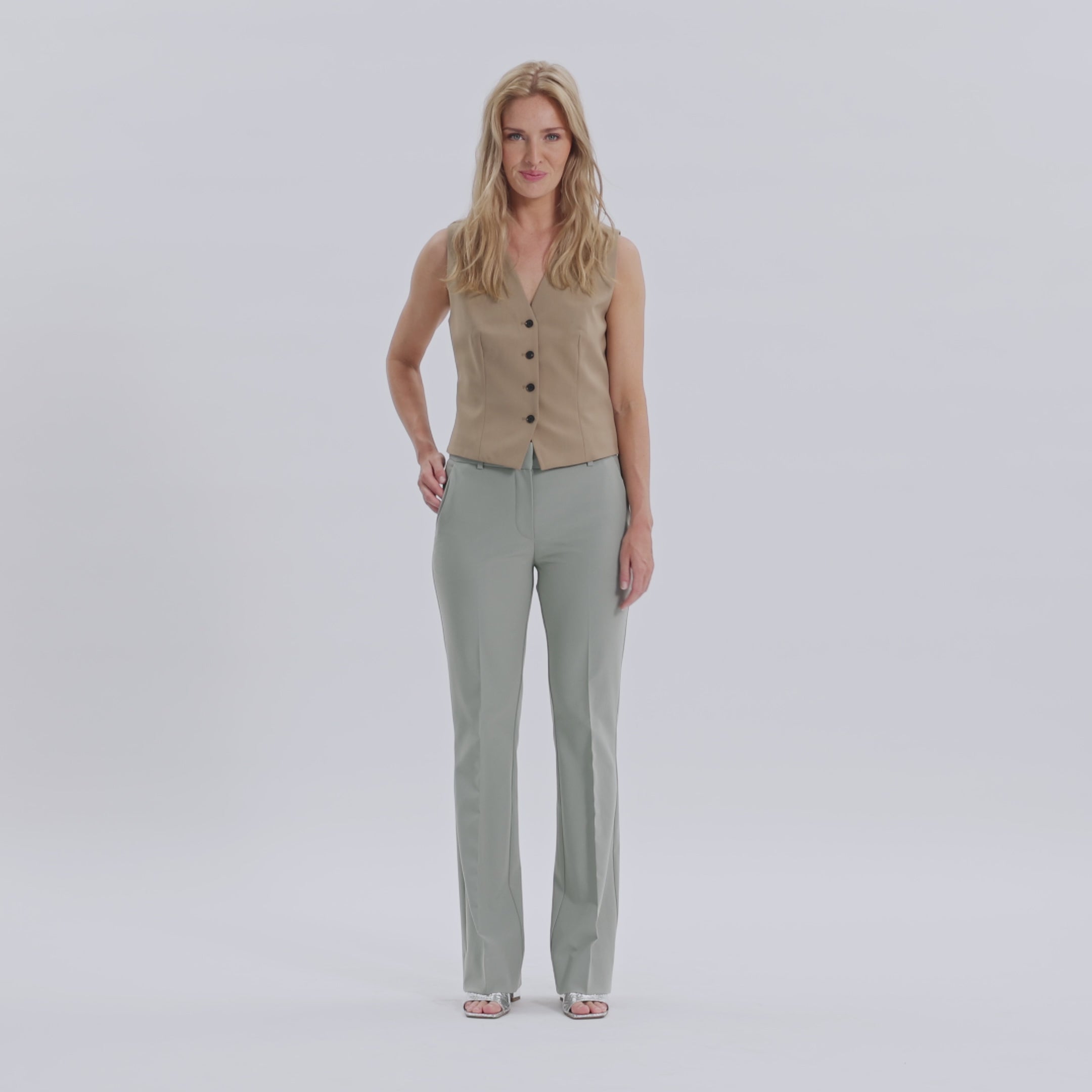 ClaraFV are flared-fit trousers. Being mid-waisted, we shaped them to rest on your hips, accentuate your hips and thighs, and flare from your knees down. The creases, outstanding leg details, and a highly versatile silhouette allow you to style them in more than one way, underlining their exquisite look. Designed in Copenhagen and made by specialists in Turkey.