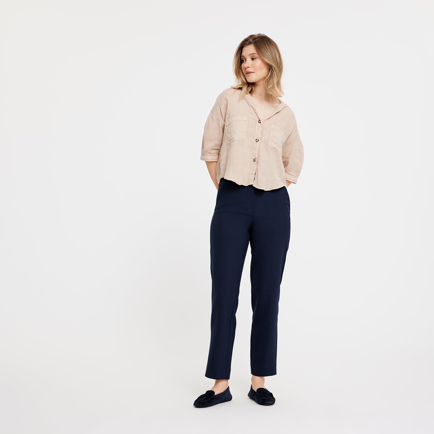DaphneFV are straight-fit trousers. Being high-waisted and ankle-lengthed, we shaped them to accentuate your waist and hips and sway slightly, creating a light and lively look—and feeling. A waistband, somewhat taller than usual and elasticated at the back, faithfully follows your waist's curvature. Designed in Copenhagen and made by specialists in Turkey.