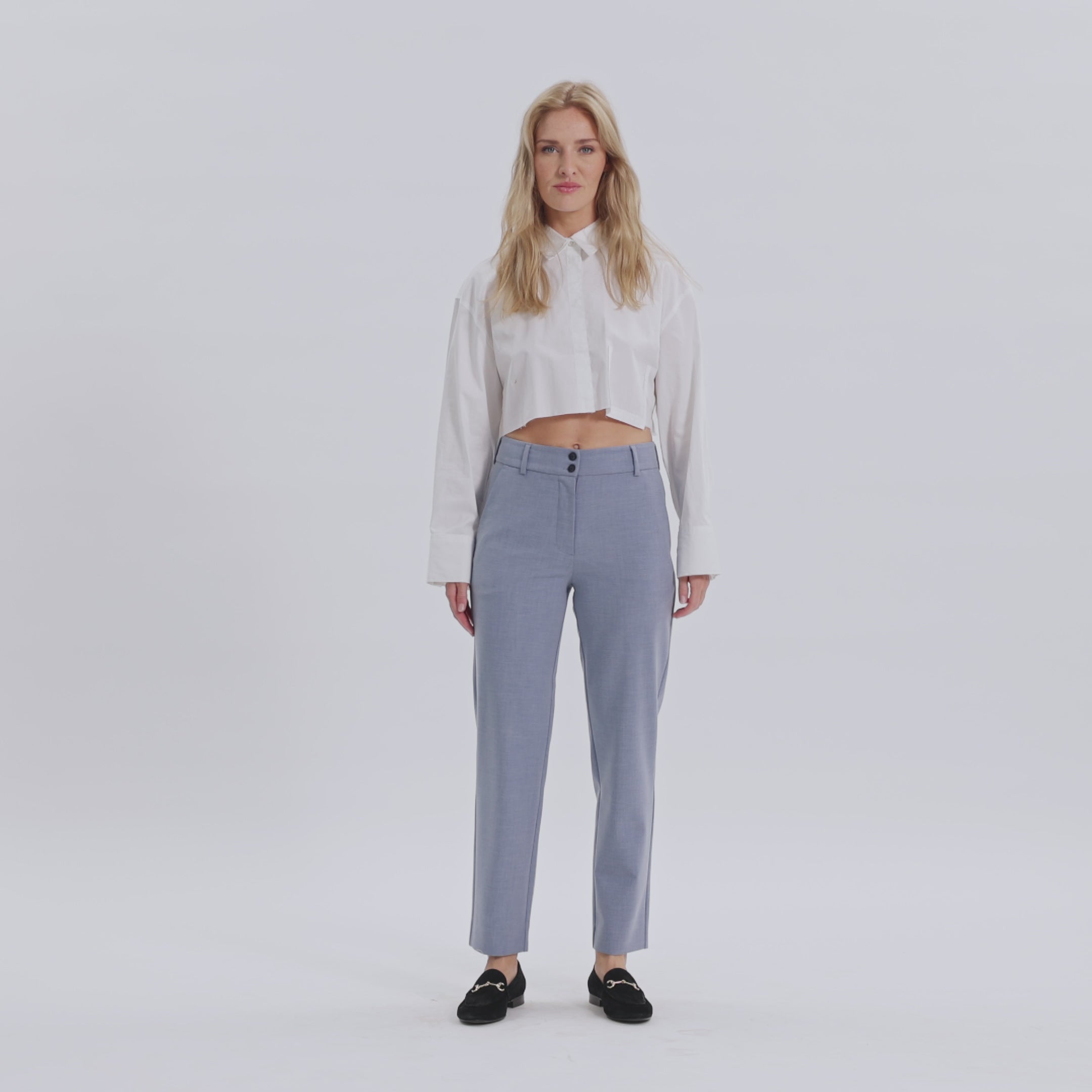 DaphneFV are straight-fit trousers. Being high-waisted, we shaped them to accentuate your waist and hips and sway slightly, creating a light and lively look—and feeling. A waistband, somewhat taller than usual and elasticated at the back, faithfully follows your waist's curvature. Designed in Copenhagen and made by specialists in China.