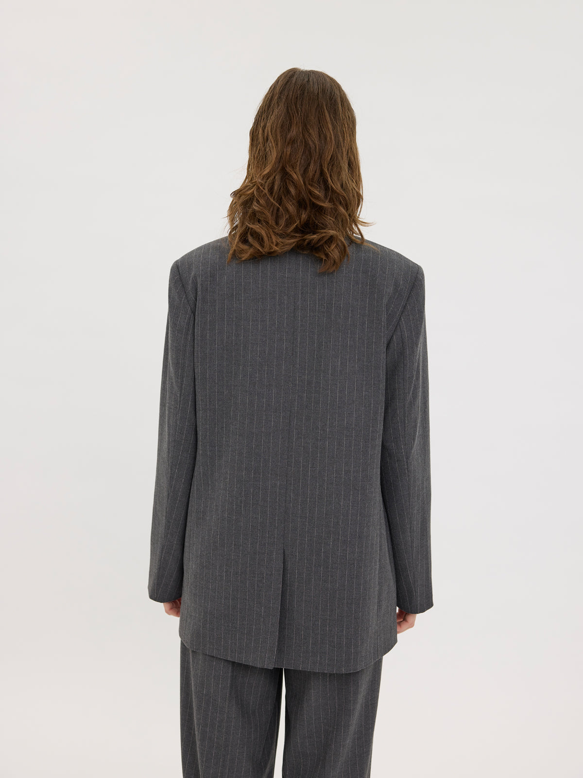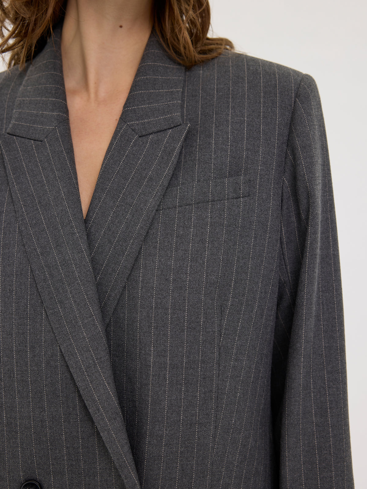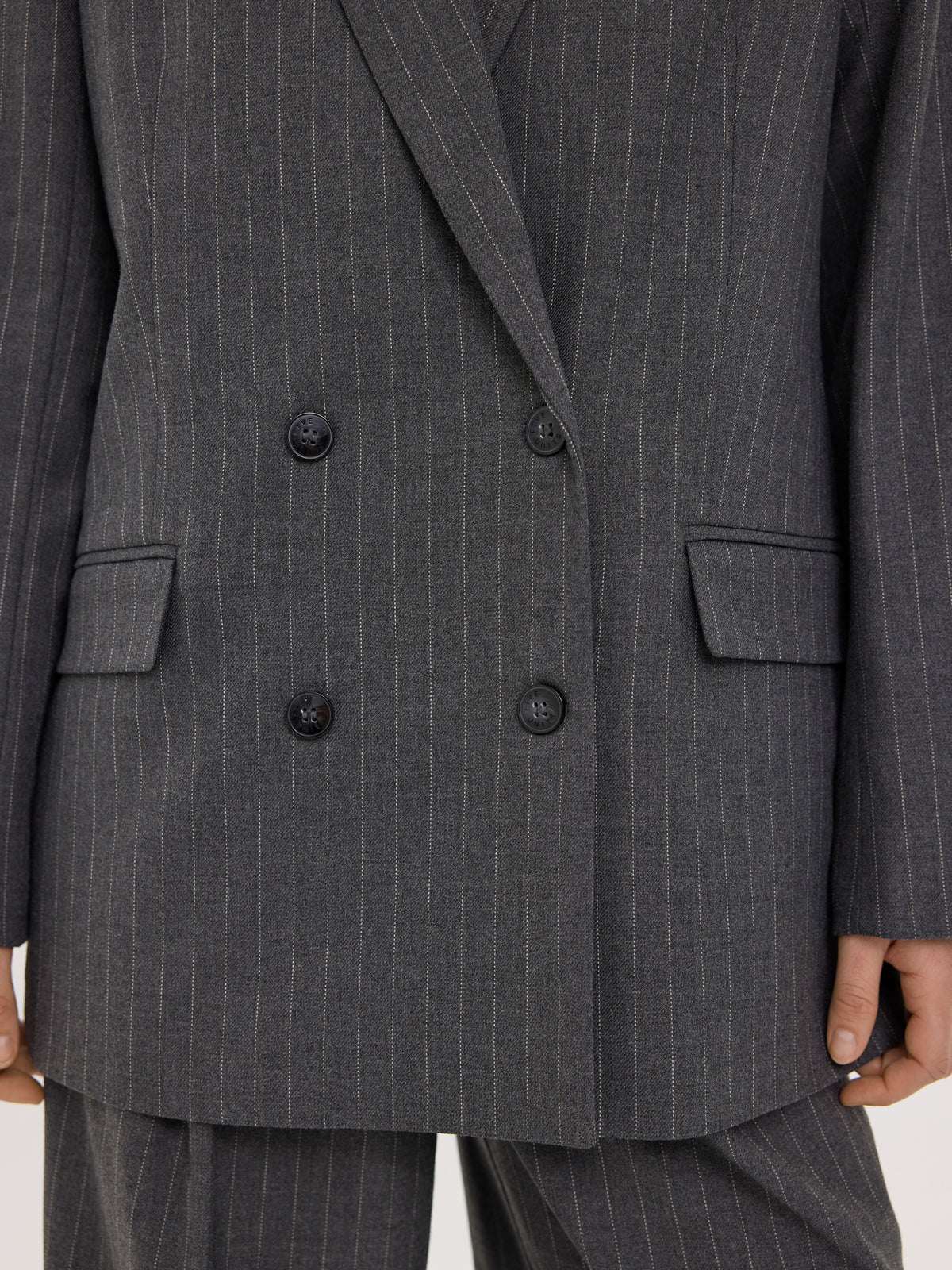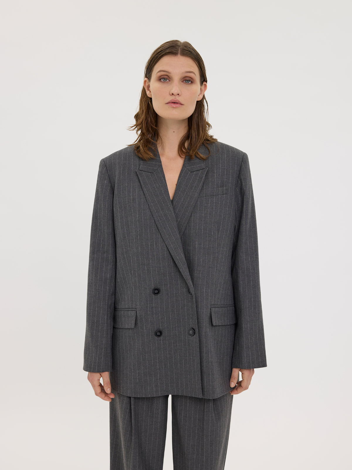A capsule piece in any modern wardrobe, this double-breasted blazer is cut from pinstrip twill for an oversized fit and is gently tailored with darts through the body and soft shoulder pads to frame your figure. It features front flap pockets and logo buttons and a back slit for ease of movement. Designed in Copenhagen and made by specialists in Turkey.