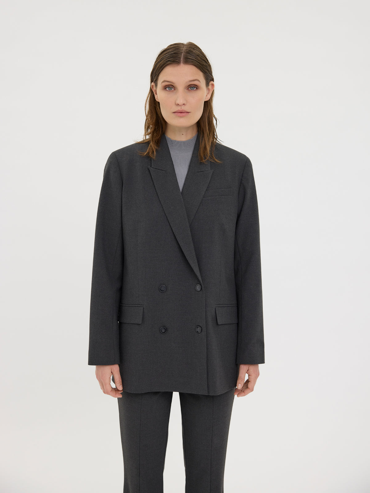 A capsule piece in any modern wardrobe, this double-breasted blazer is cut for an oversized fit and is gently tailored with darts through the body and soft shoulder pads to frame your figure. It features front flap pockets and logo buttons and a back slit for ease of movement. Designed in Copenhagen and made by specialists in Turkey.