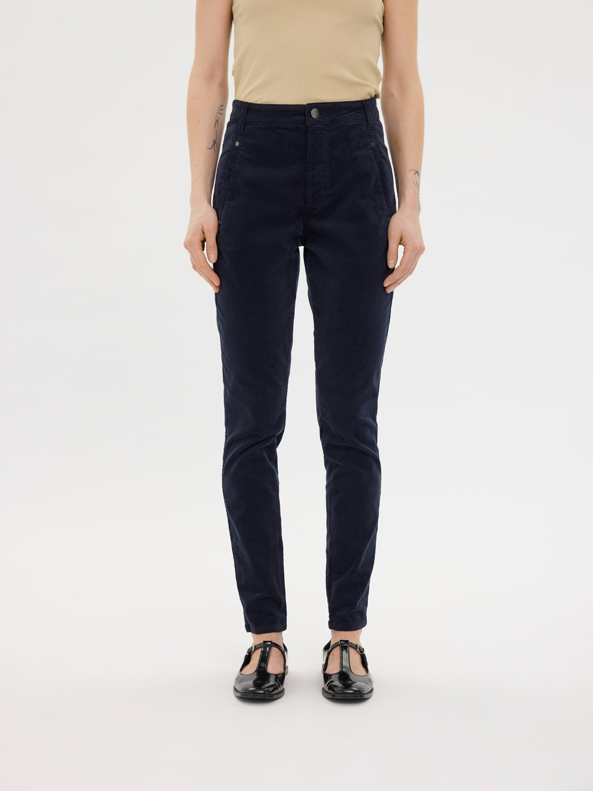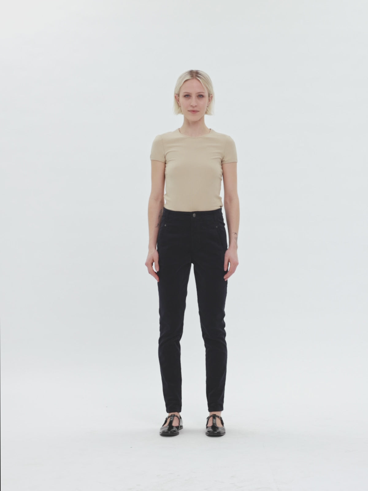 The JolieFV Pure trousers embody casual elegance with a sleek, slim-fit silhouette that flatters without clinging. Mid-waisted and designed to sit on the hips, their streamlined pin-wale corduroy construction features integrated, rivet-reinforced side-seam pockets and stitched hems for durability and functionality, while the minimalist design ensures timeless versatility. Designed in Copenhagen and made by specialists in Turkey.