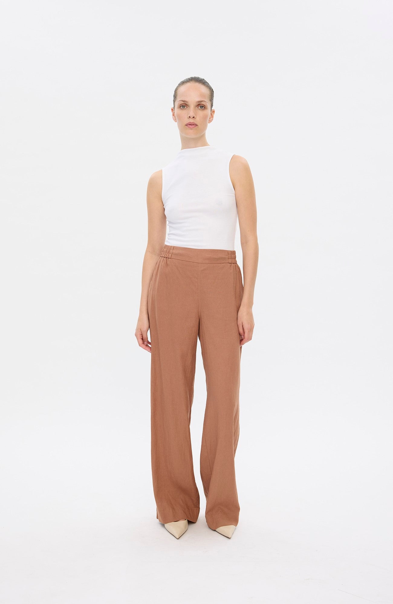 LineaFV are wide-fit trousers crafted from crisp linen-blend fabric in a fine structure. Being mid-waisted, we shaped them to rest on your hips and be roomy around your waist, hips and thighs. The easily accessible slanted front pockets, one patched back pocket, elasticated waistband, and drawstring underline Linea's effortless nature and no-frills look. Designed in Copenhagen and made in China.