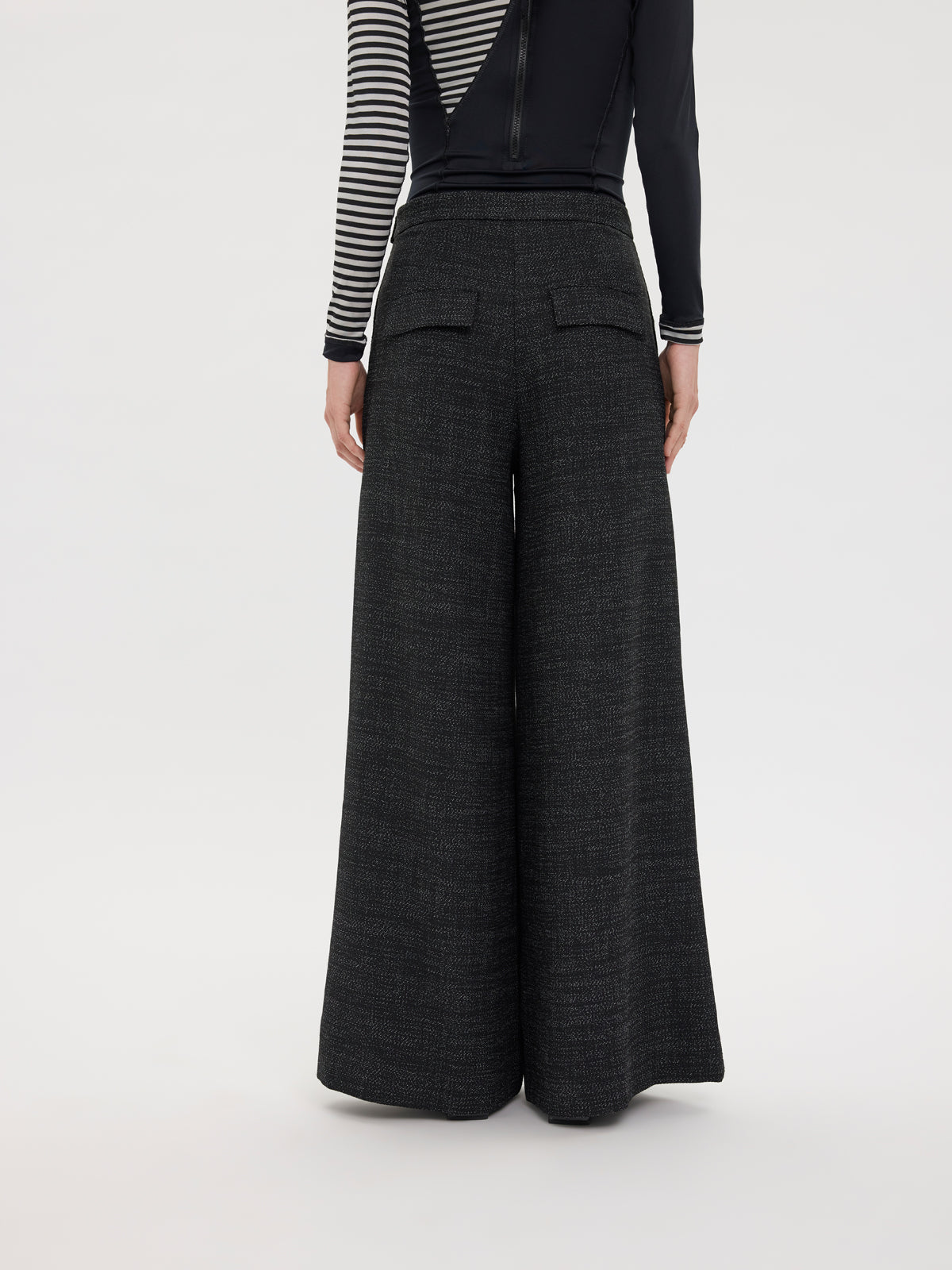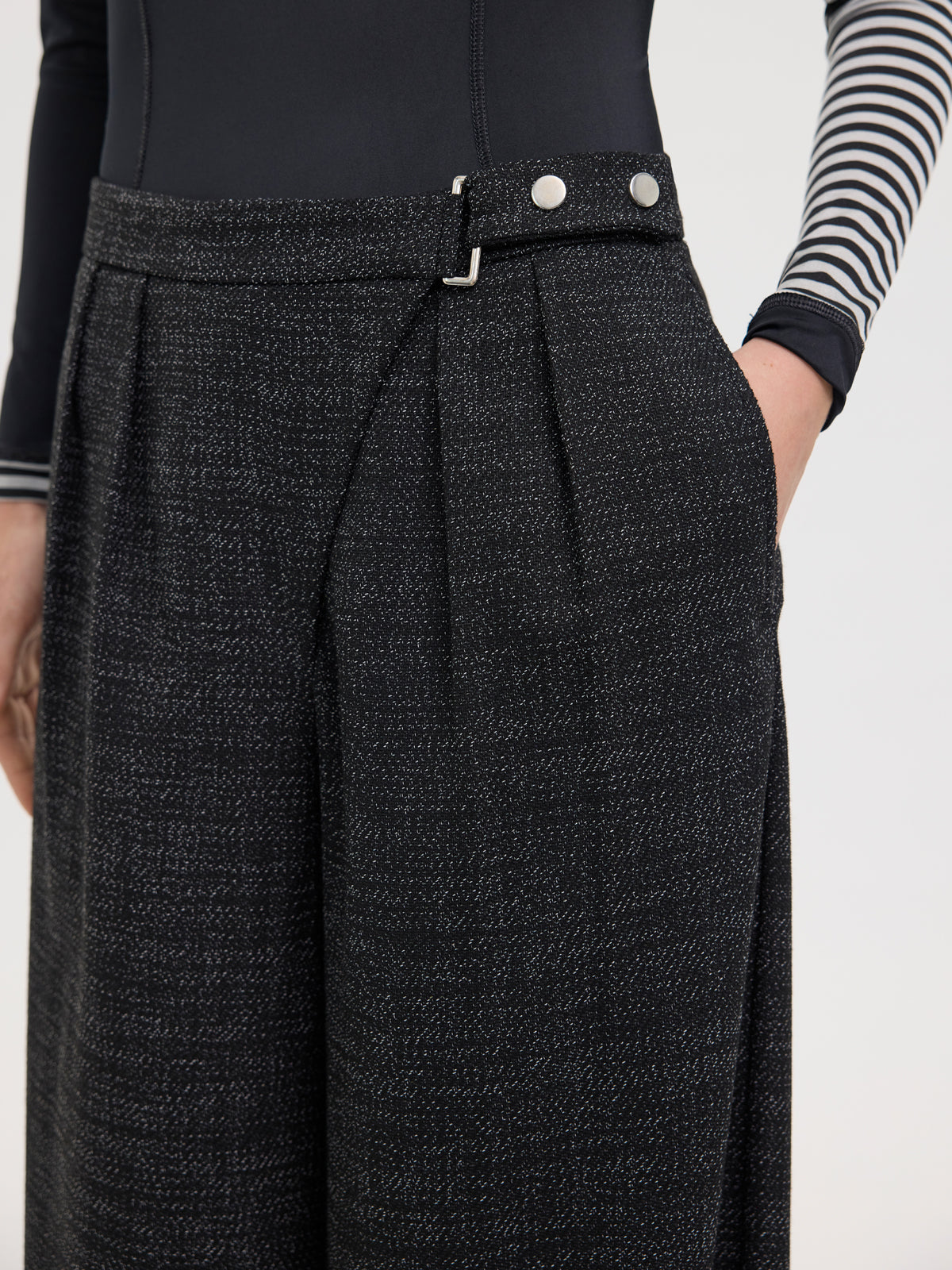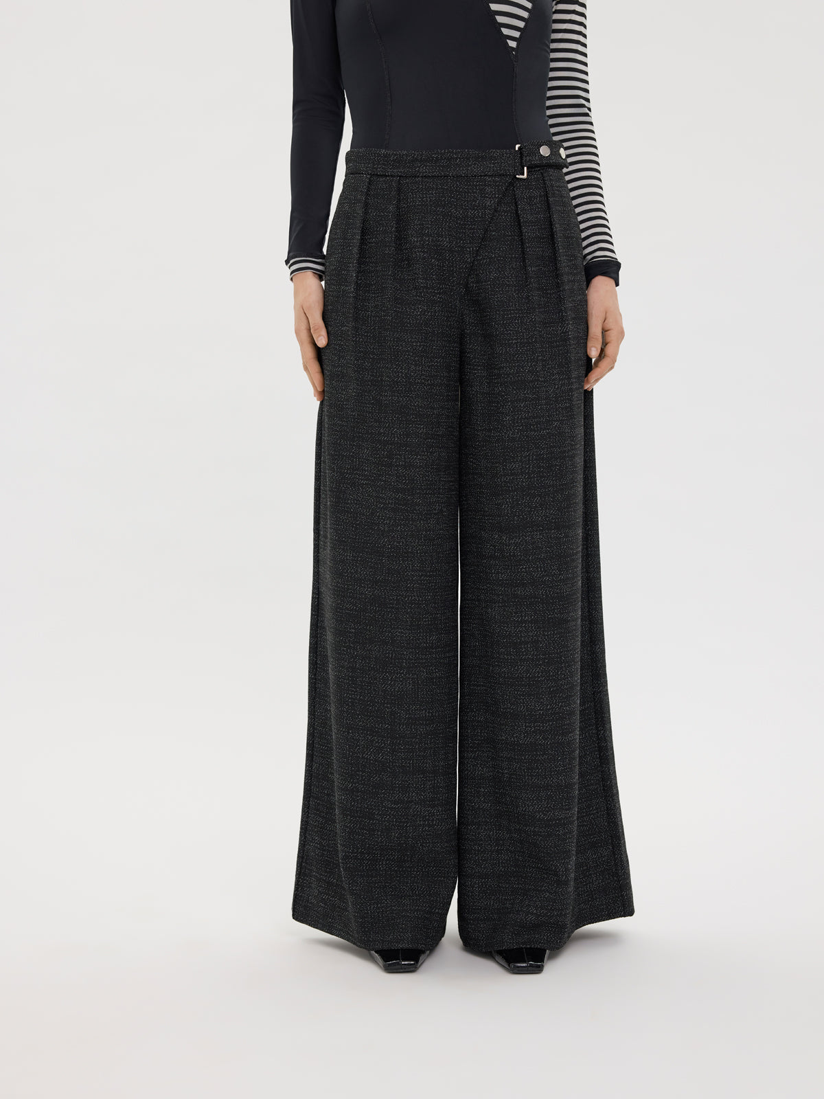 The wide-leg UmaFV trousers feature a gently flared silhouette for an elegant yet relaxed look. Crafted from structured recycled wool-blend, they’re designed with an asymmetrical front fastening, secured by a buckle, press studs and zip fly for a polished finish. They include functional side seam pockets and back flap pockets. Front pleats add structure and definition to the silhouette. Designed in Copenhagen and made by specialists in Turkey.