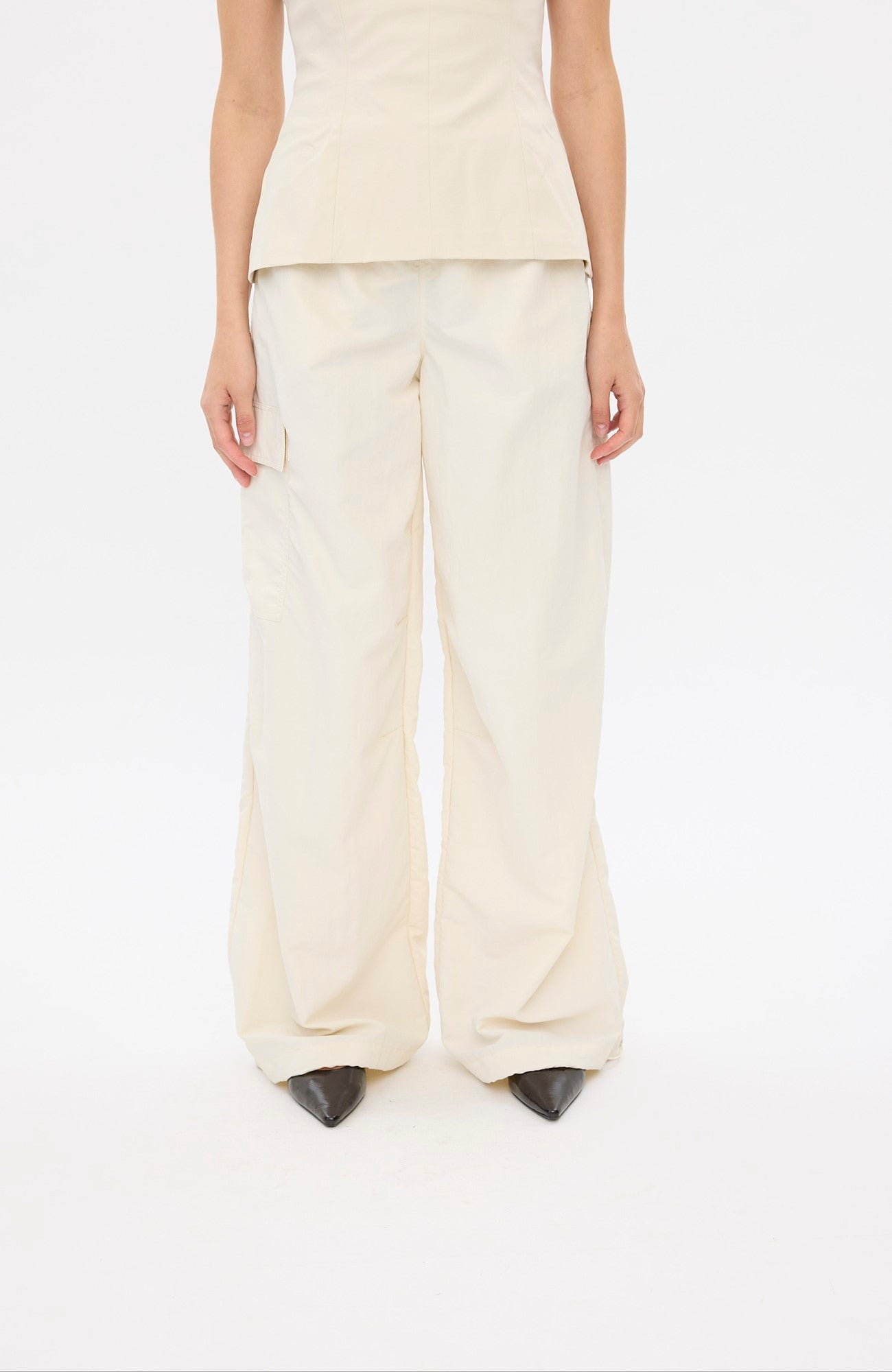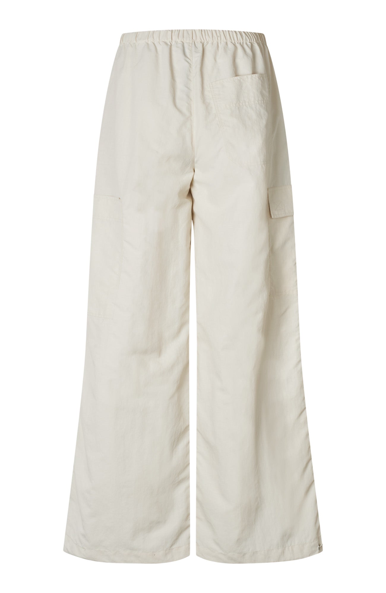 Loose mid-waisted trousers with elastic drawstring waistband, slanted front pockets, patch pockets with Velcro flaps, and adjustable hem with string tie for a custom fit. Designed in Copenhagen.