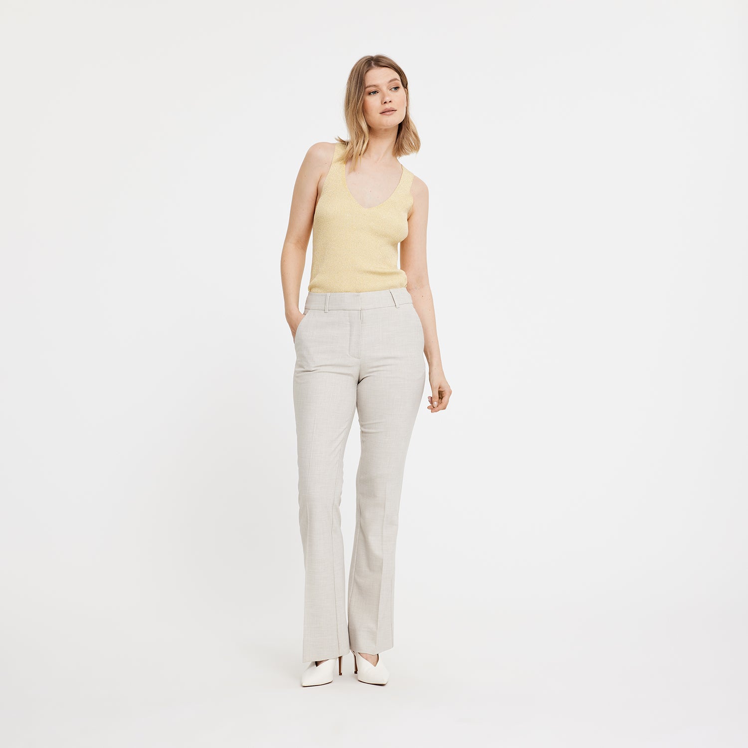 ClaraFV er ‘flared-fit’ bukser. De er mellemtaljede og designet til at hvile på hofterne, fremhæve dine hofter og lår, og blive vide fra knæene og ned. Deres elegante look understreges af deres flotte silhuet, der kan styles på forskellige måder. De er designet i København og lavet af specialister i Tyrkiet.