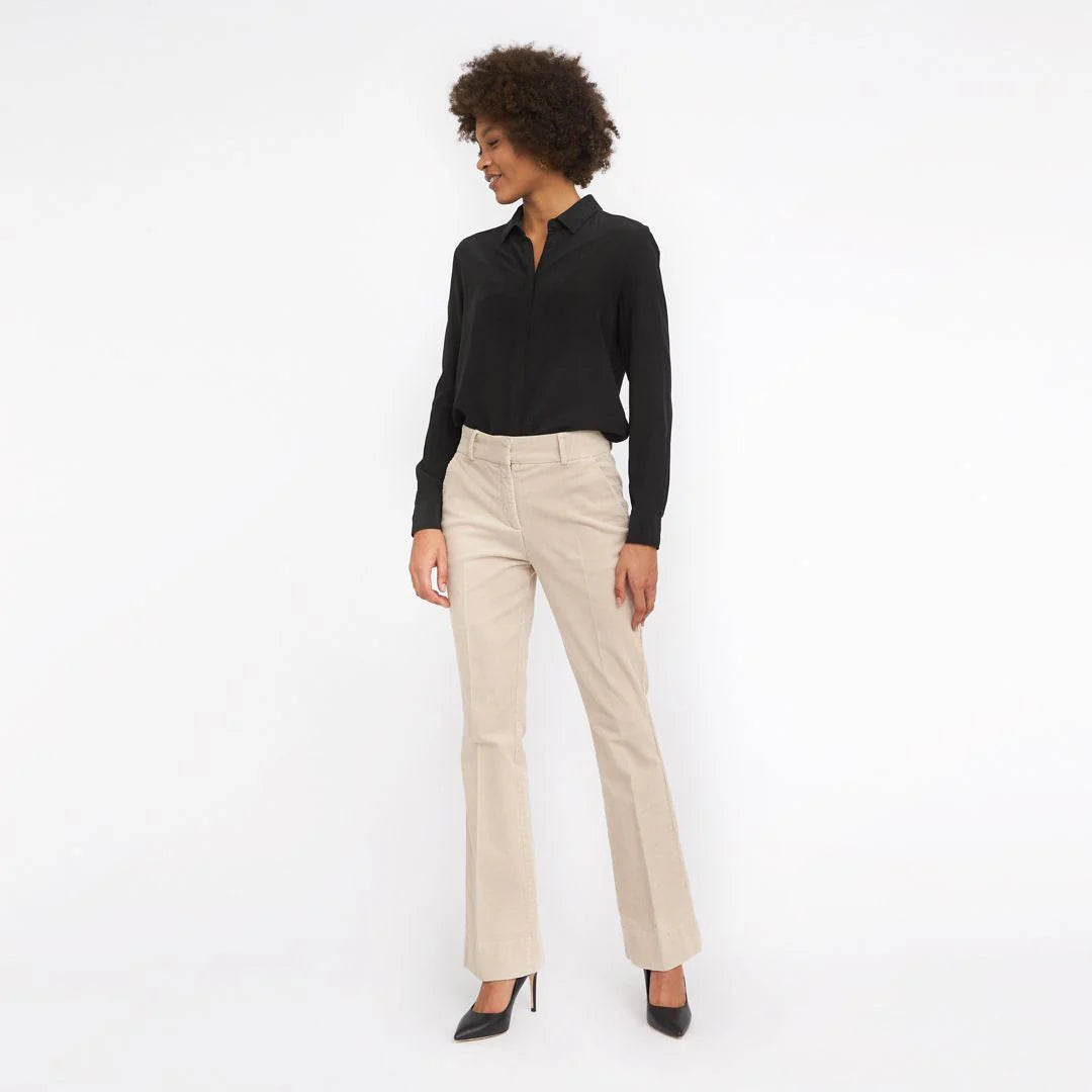 ClaraFV are flared-fit trousers. Being mid-waisted, we shaped them to rest on your hips, accentuate your hips and thighs, and flare from your knees down. The creases, outstanding leg details, and a highly versatile silhouette allow you to style them in more than one way, underlining their exquisite look. Designed in Copenhagen and made by specialists in Turkey.
