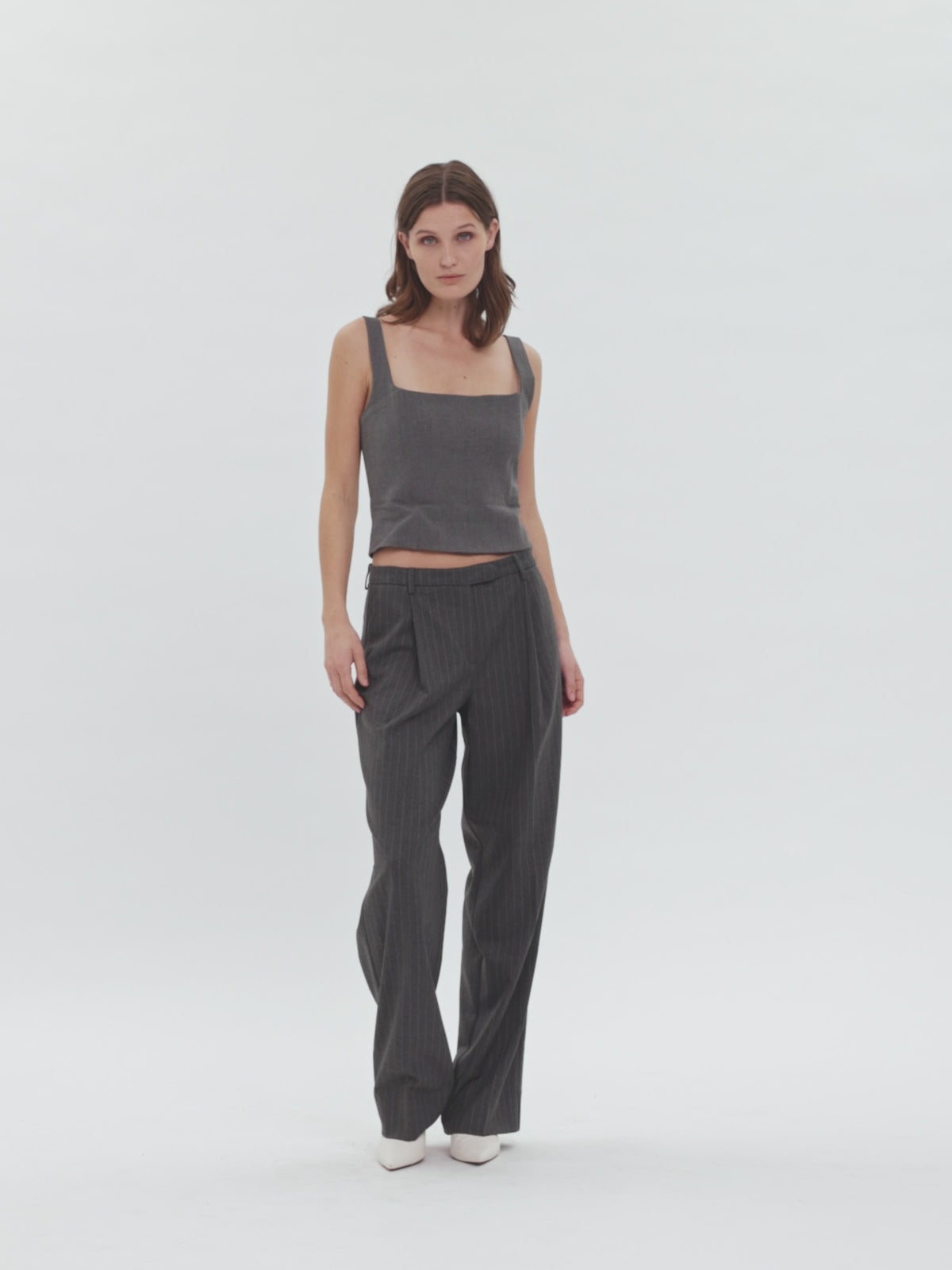 Disse sofistikerede bukser med lige ben er lavet af kraftig twill vævet med nålestriber og har en vid bensilhuet. De er designet til at sidde midt på taljen og har en forlænget hægte- og stanglukning for en elegant silhuet. Pressede folder og falske paspolerede lommer bagpå giver et poleret, skræddersyet touch. Designet i København og fremstillet af specialister i Tyrkiet.