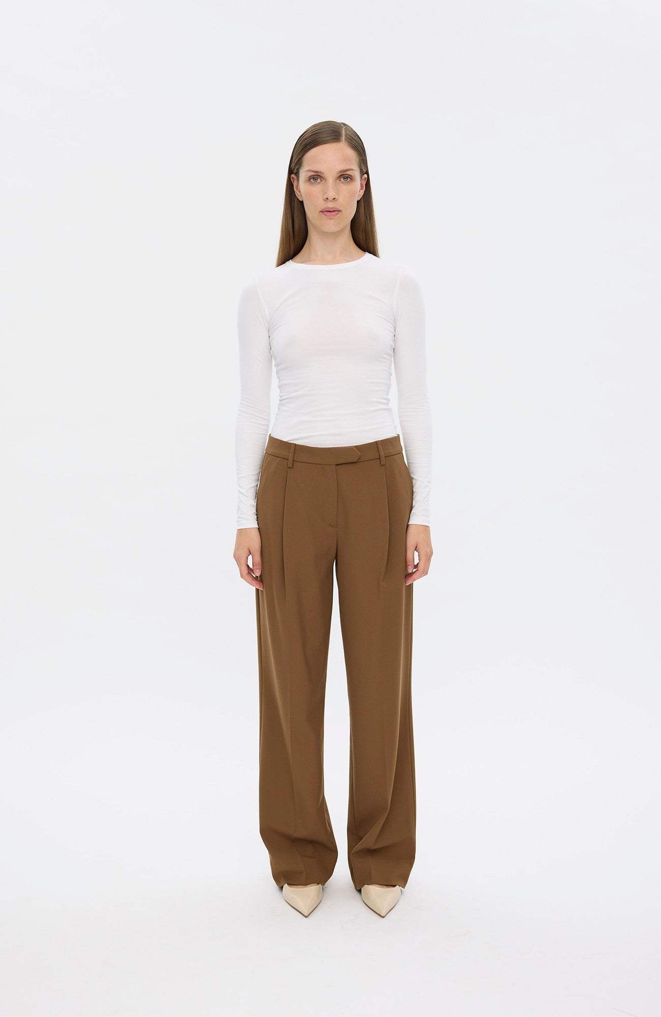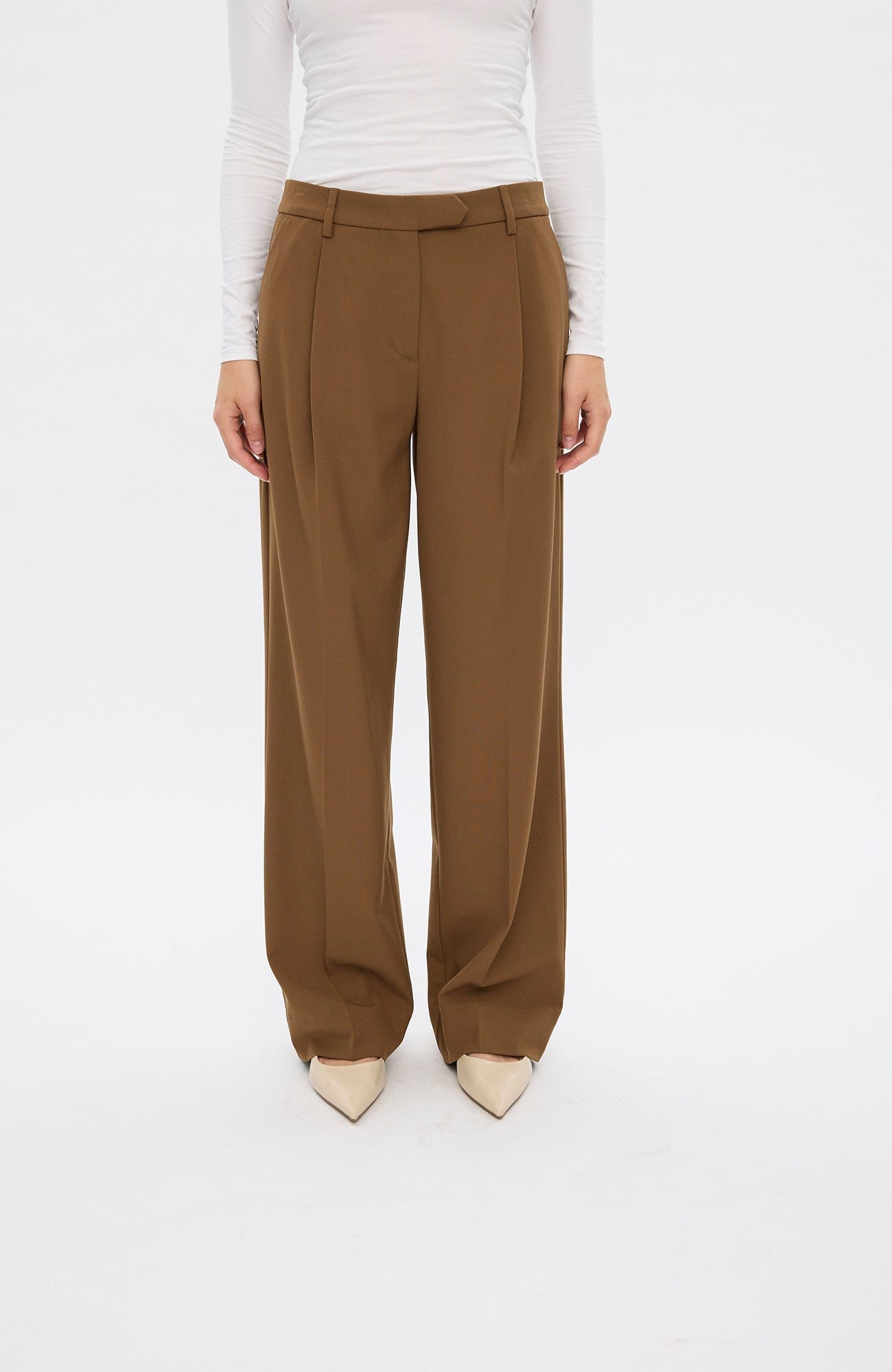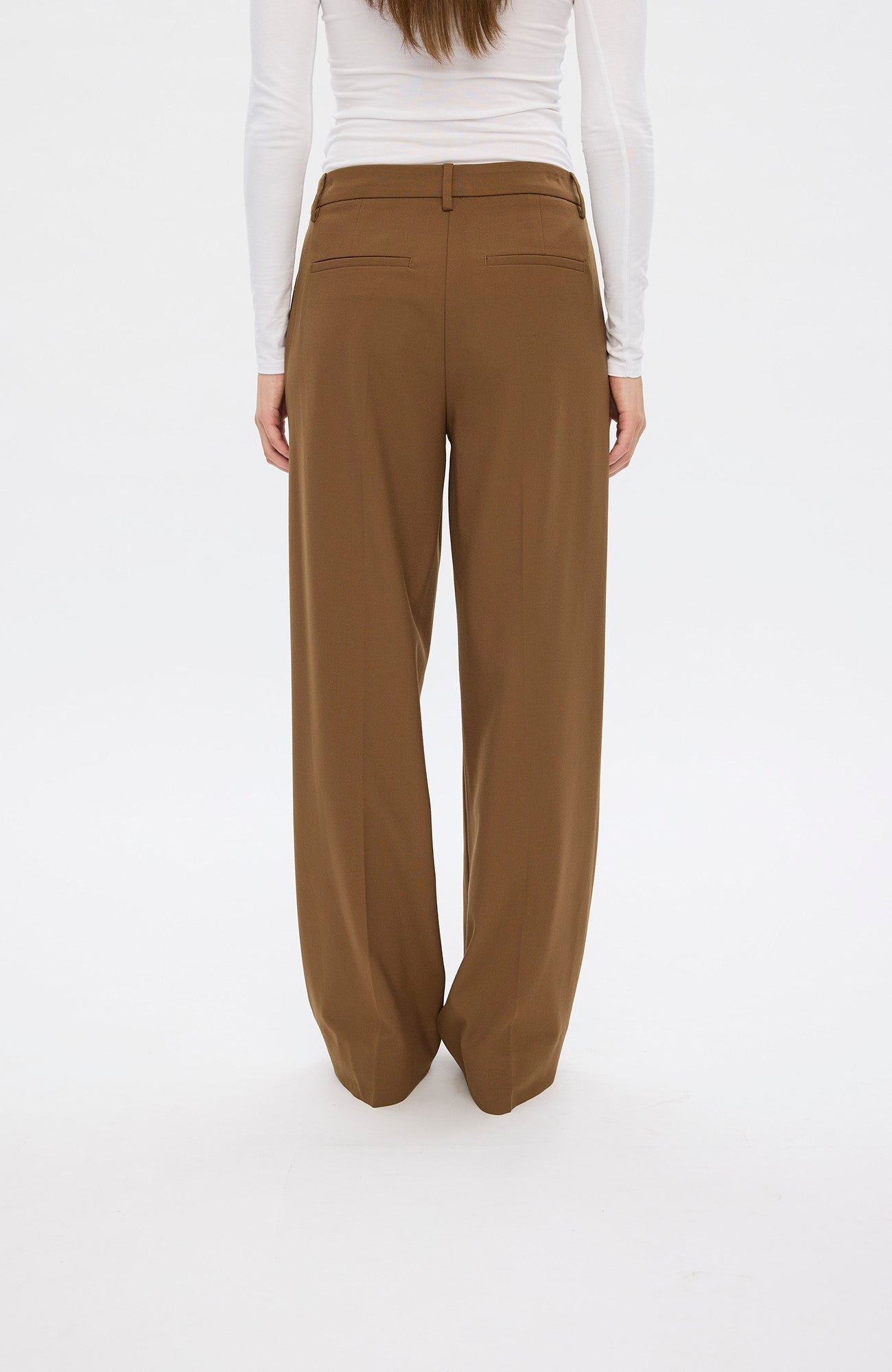 Mid-rise, full-length trousers with a straight leg and stitched front pleats. Includes slanted front pockets, faux welt back pockets, hook-and-bar closure, belt loops, and sharp crease lines. Designed in Copenhagen and made by specialists in Turkey.