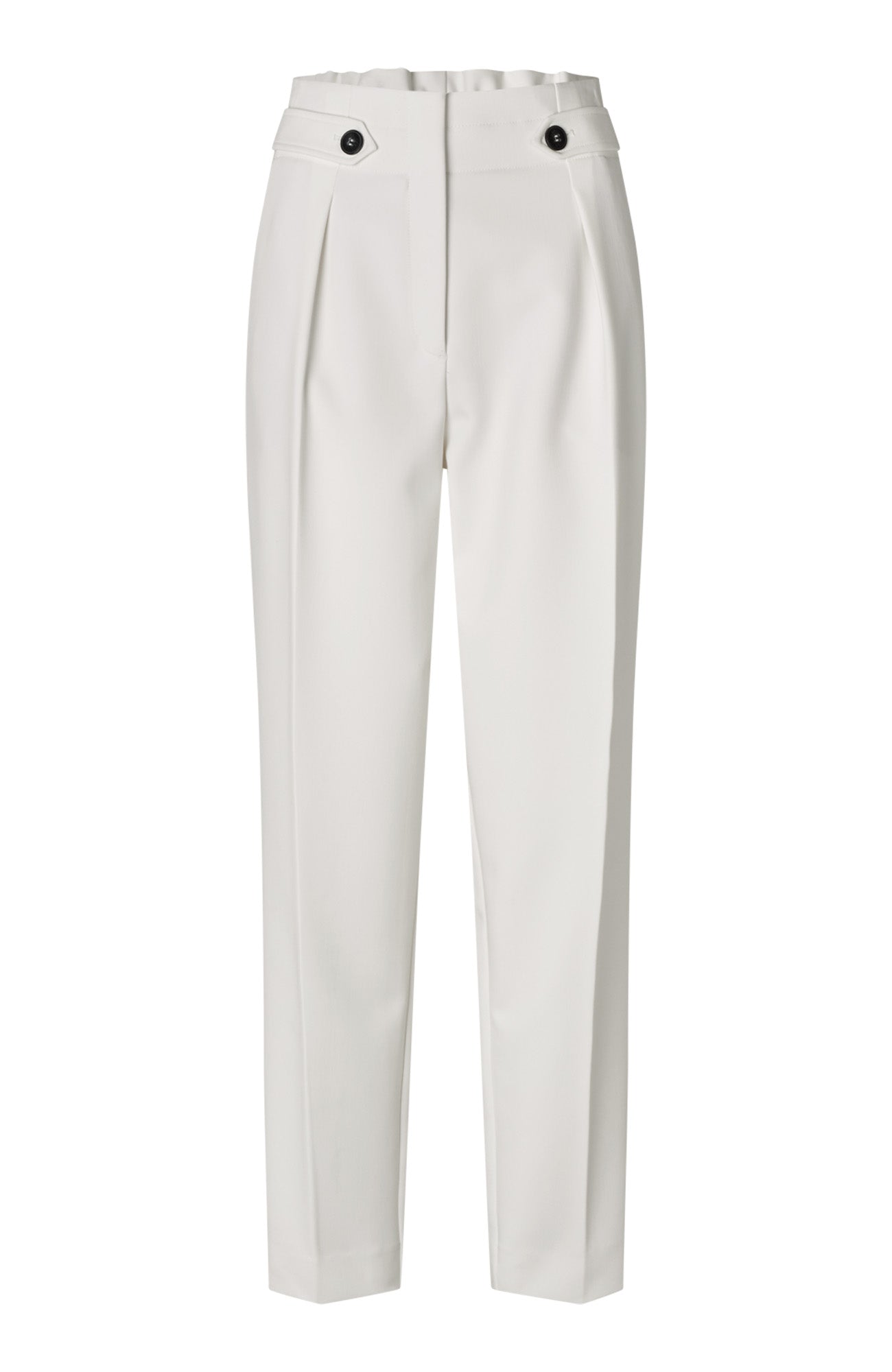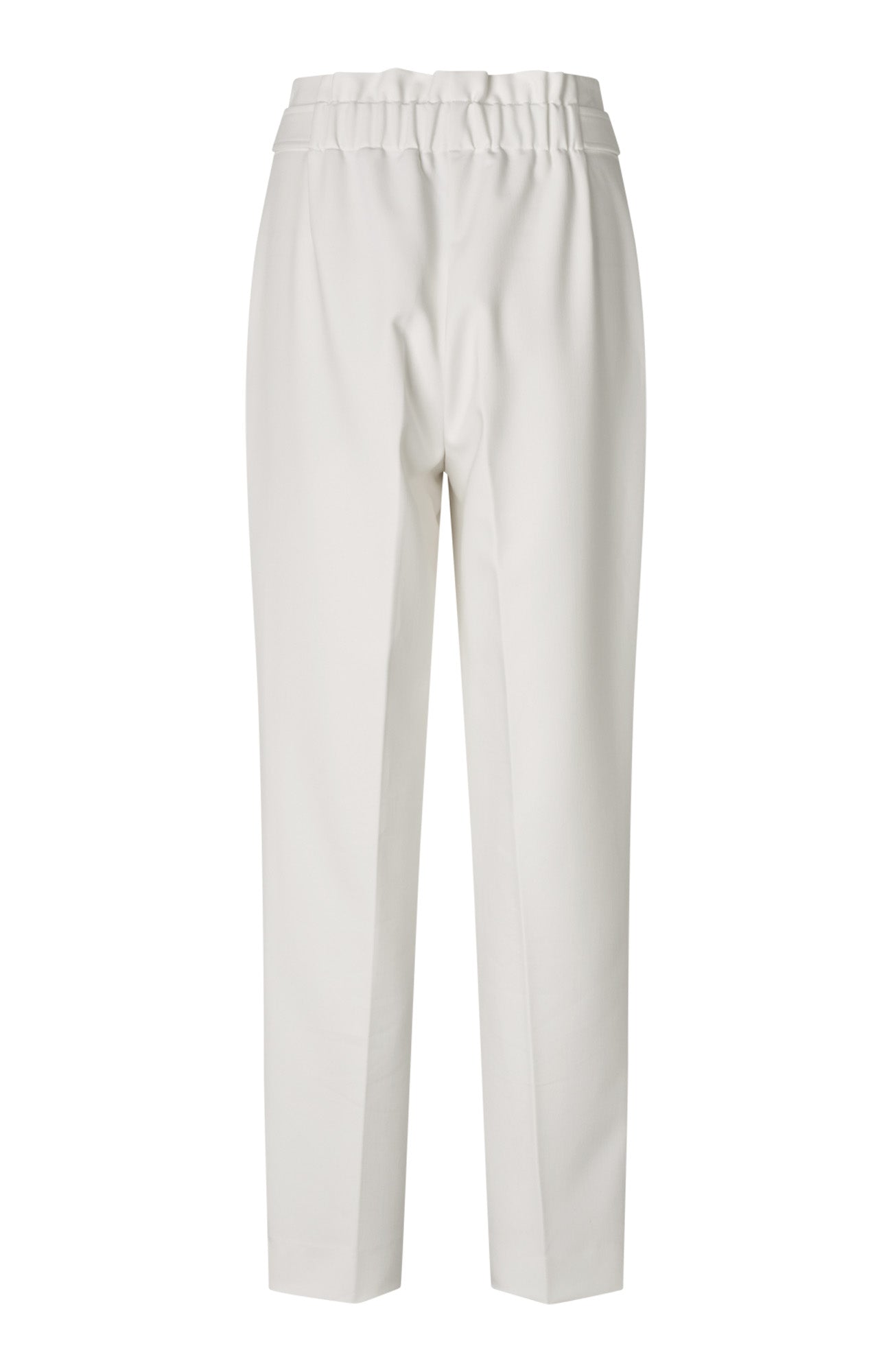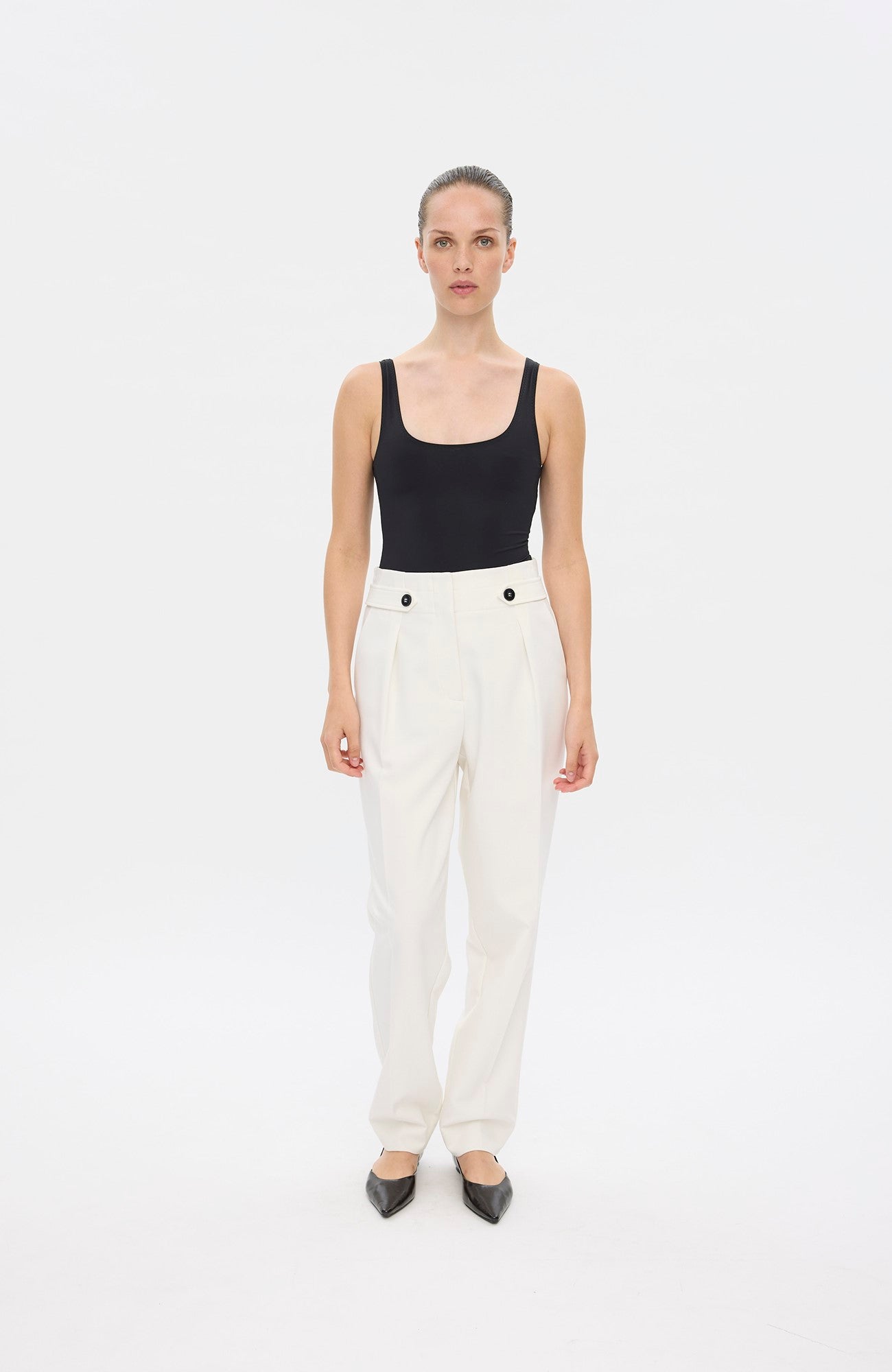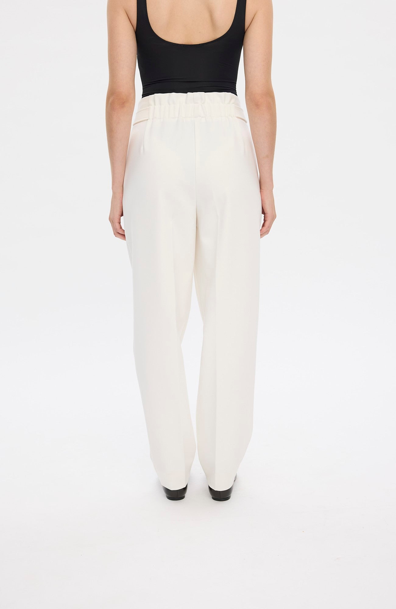 EmiliaFV har en sofistikeret silhuet, der smalner let af fra knæet, og har en høj talje med en elastisk indsats i papirpose-stil bagpå for både komfort og en struktureret pasform. Pressede folder langs benene giver et poleret, raffineret touch, mens skrålommer foran med trenseforstærkninger tilbyder funktionalitet. Bæltestropper med knapper i sidesømmene definerer taljen. Designet i København.