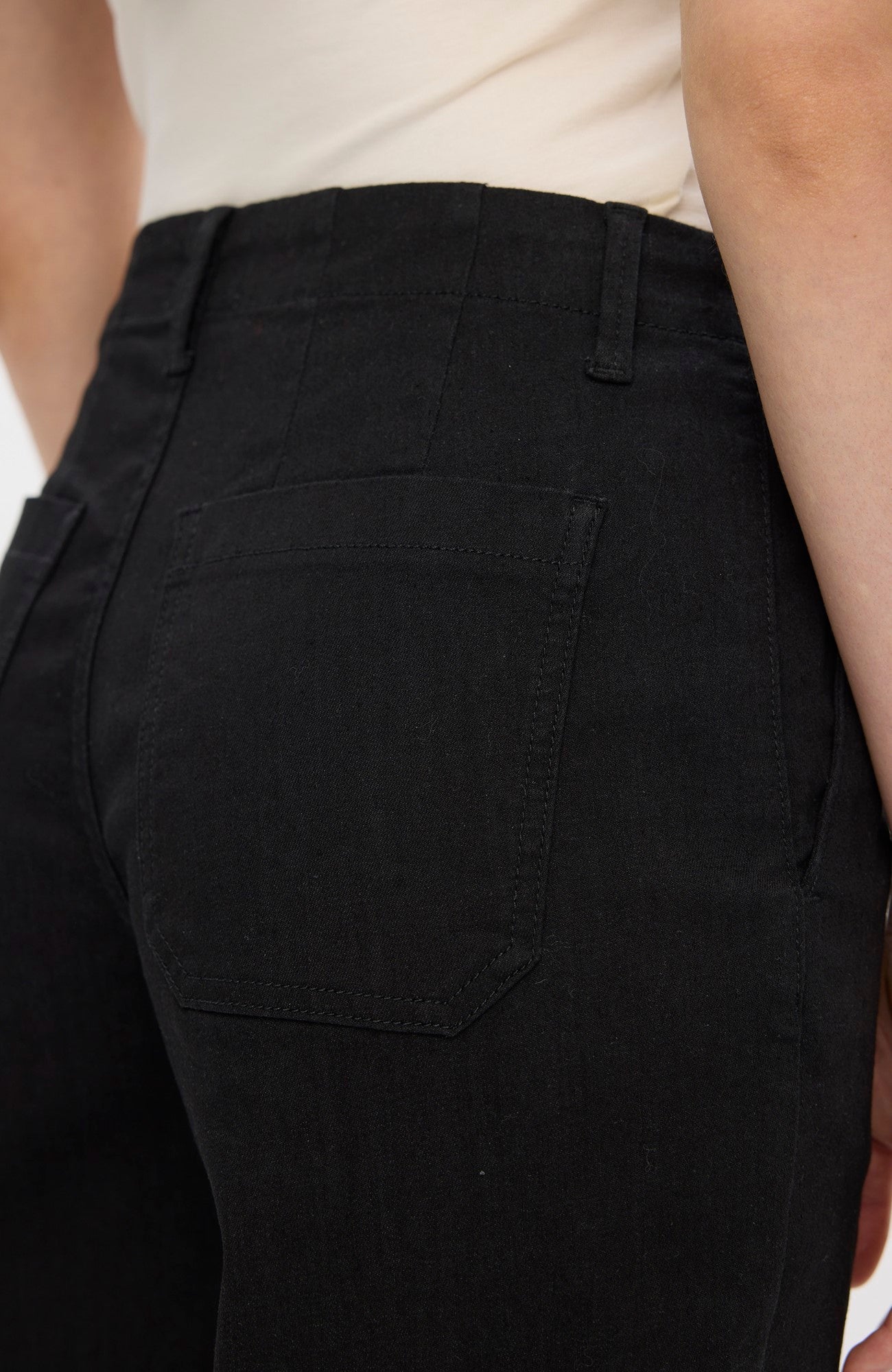 EricaFV har et afslappet og rent udseende og sidder på en opbygget linning med bæltestropper og en lynlås med knaplukning. De er skåret lige i en silhuet med vide ben og har subtile detaljer i form af syninger og påsatte baglommer. Designet i København, fremstillet af specialister i Tyrkiet.