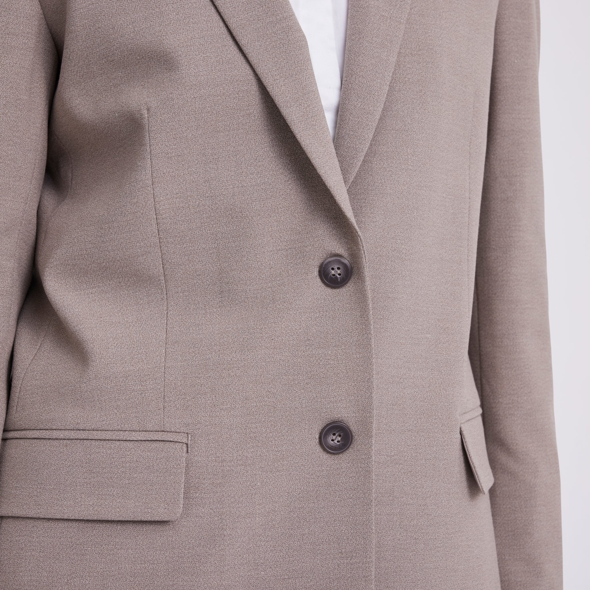 HannahFV er skåret i en straight fit-silhuet med et enkelt bryst og har en blød, skulpturel stil med minimale detaljer som logoknapper, et skåret revers, en funktionel brystlomme og klaplommer foran. Indsnit i siderne og bløde skulderpuder indrammer kroppen, mens en slids i ryggen sikrer bevægelsesfrihed. Designet i København, fremstillet af specialister i Tyrkiet