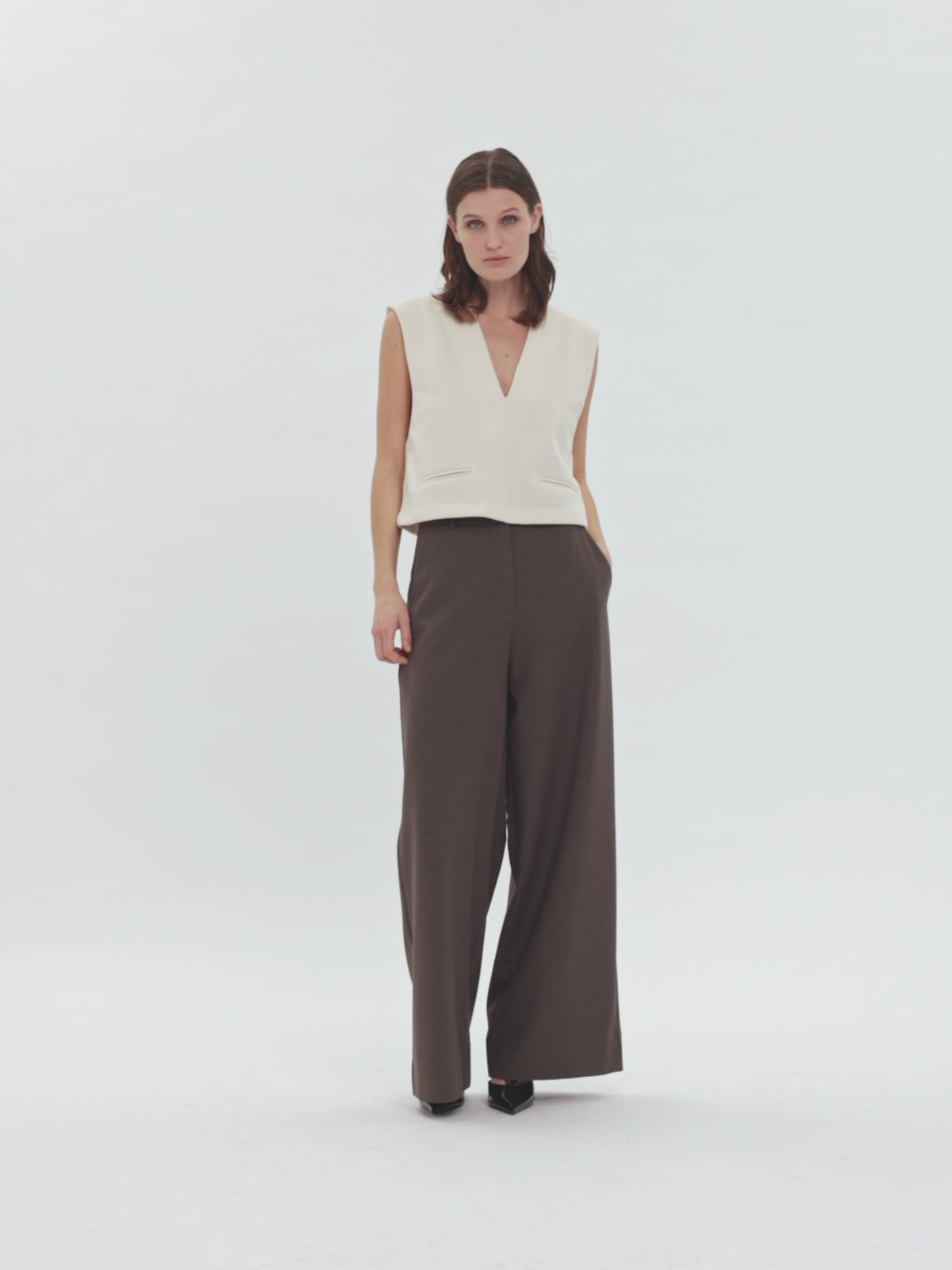 LauraFV er bukser i fuld længde, skåret i en ren silhuet. De er designet til en høj pasform med slanke, brede ben, der ser elegante ud med både flade og høje sko, og har knappede paspolerede lommer for en skræddersyet finish. Designet i København og fremstillet af specialister i Kina.