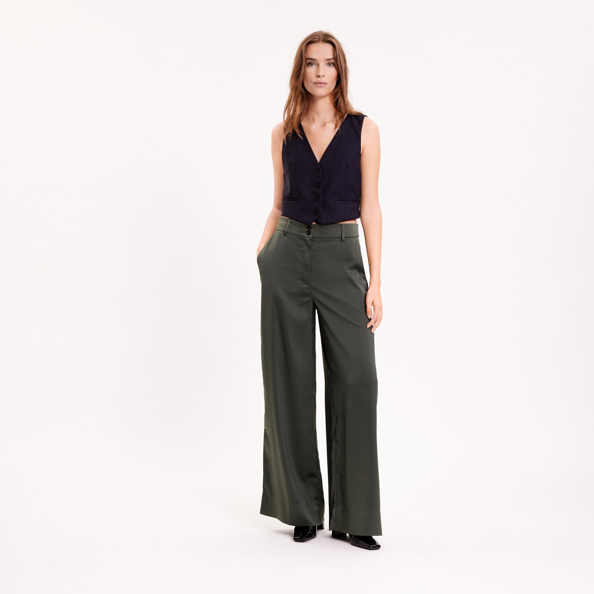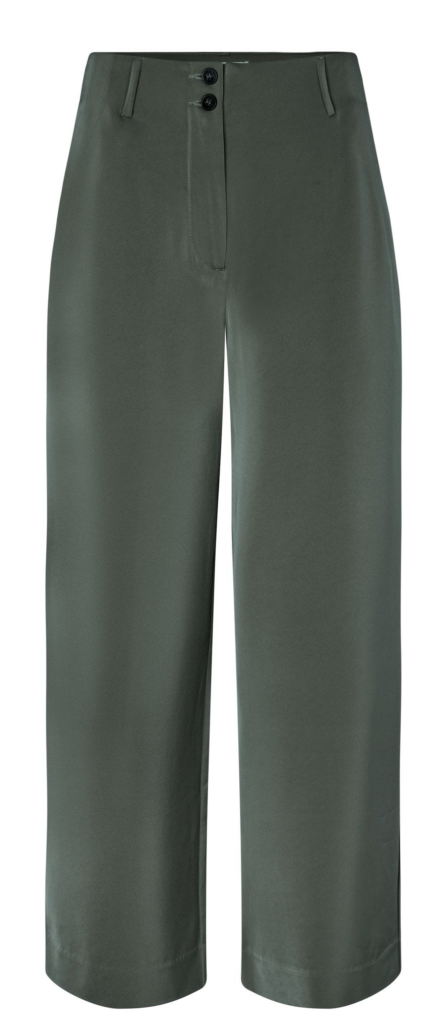 LauraFV er bukser i fuld længde. De er designet med en høj talje og slanke, vide ben, der ser elegante ud sammen med et par flade sko. De paspolerede lommer med knapper sørger for den skræddersyede finish. Designet i København, og fremstillet af specialister i Kina.