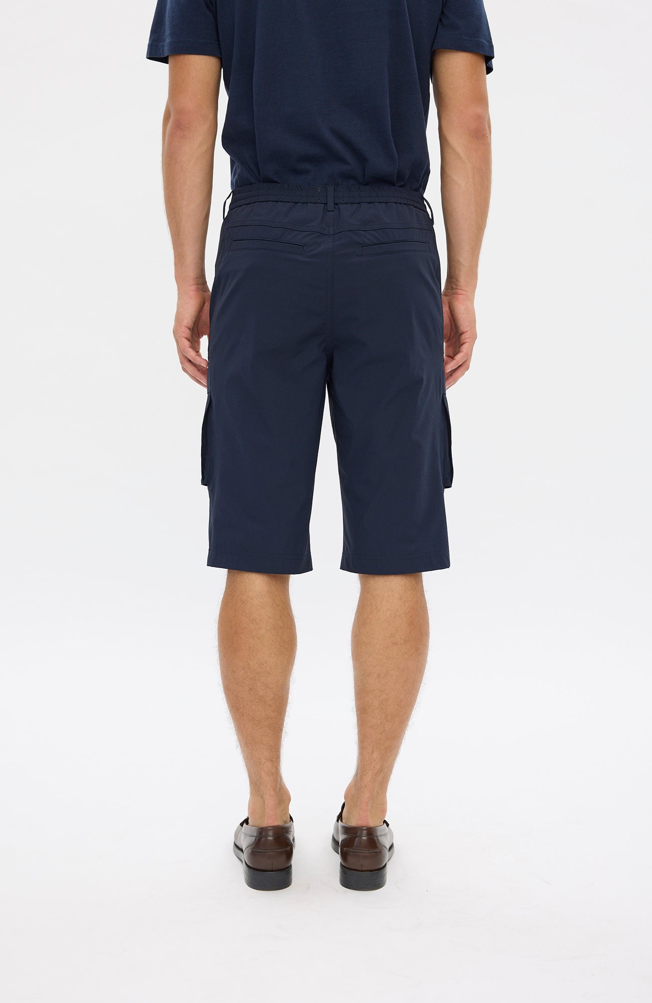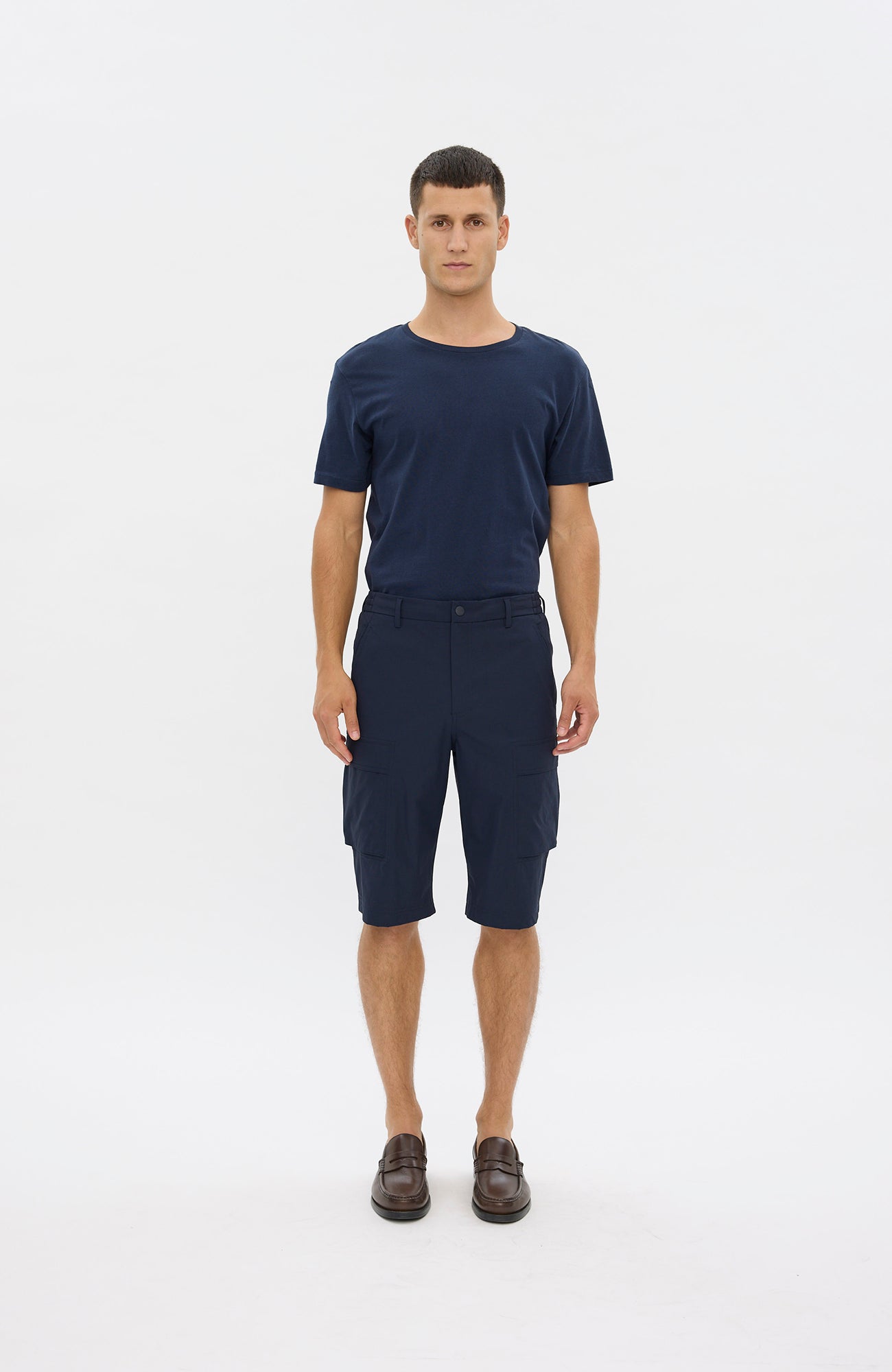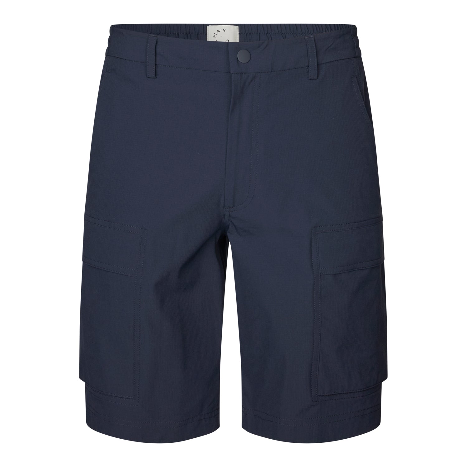 Rent skårne cargoshorts med lige pasform og mellemhøj talje. Funktioner inkluderer integrerede cargolommer, skrå sidelommer, delvis elastisk linning og bæltestropper. Designet i København.