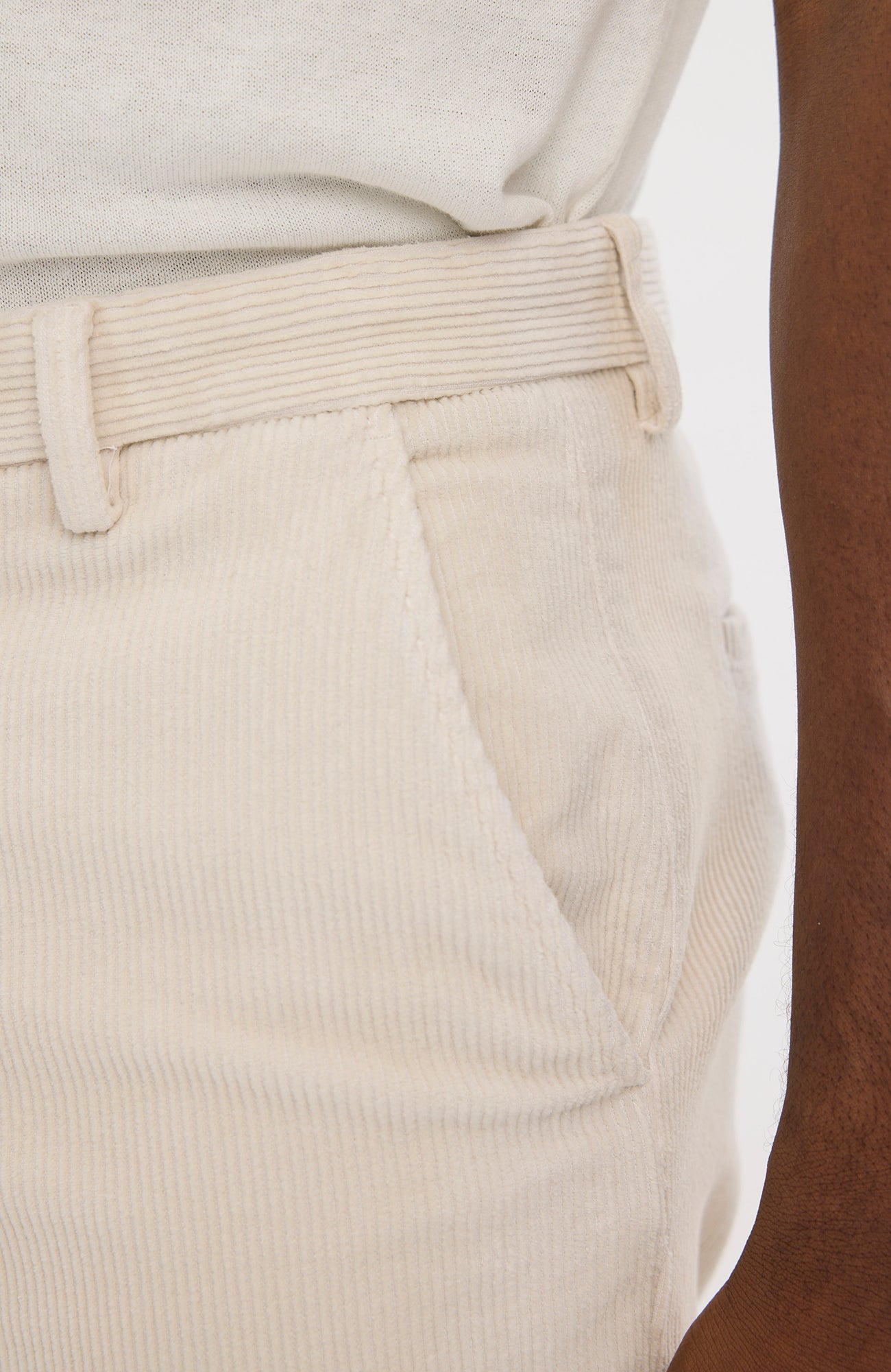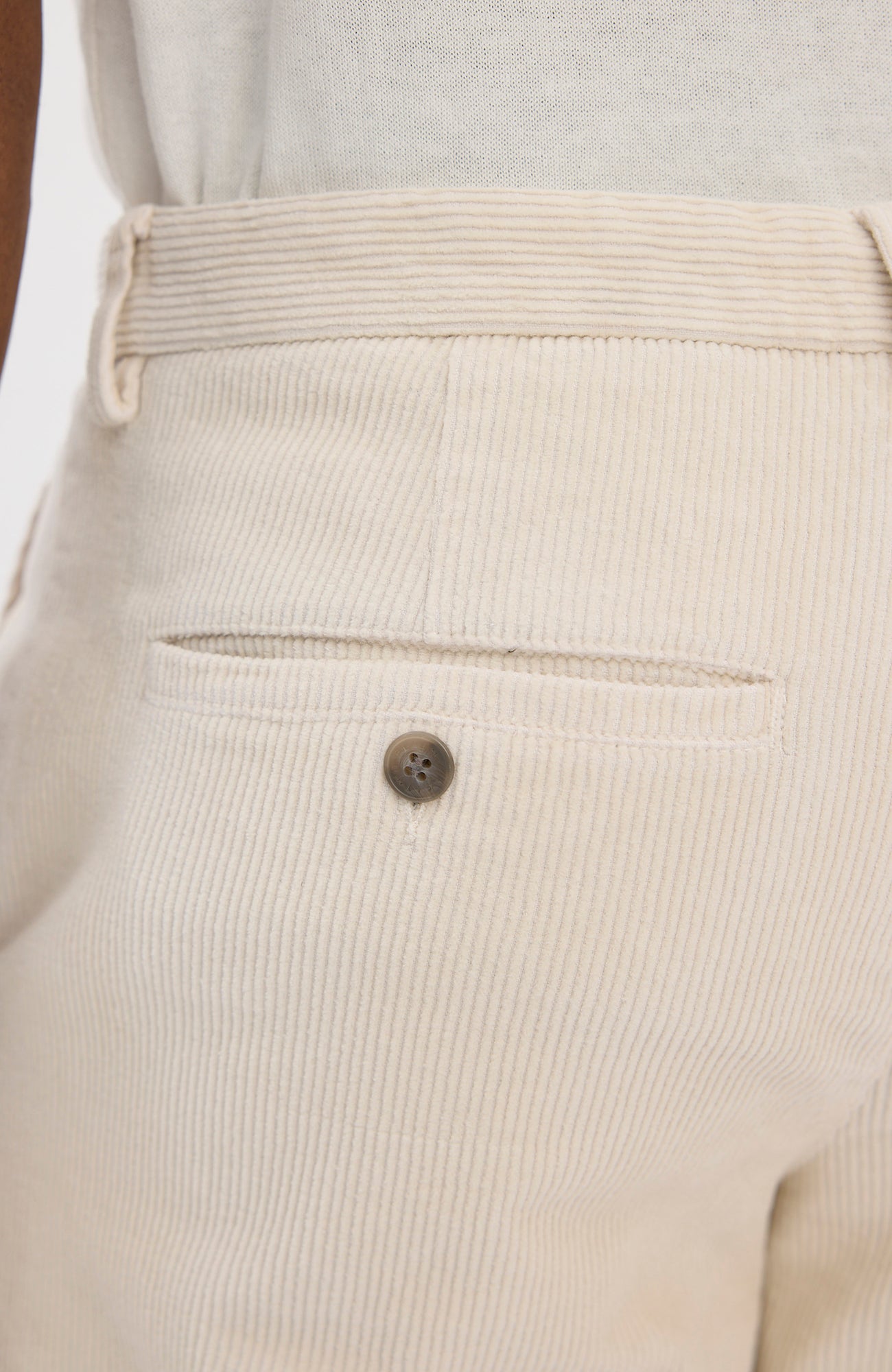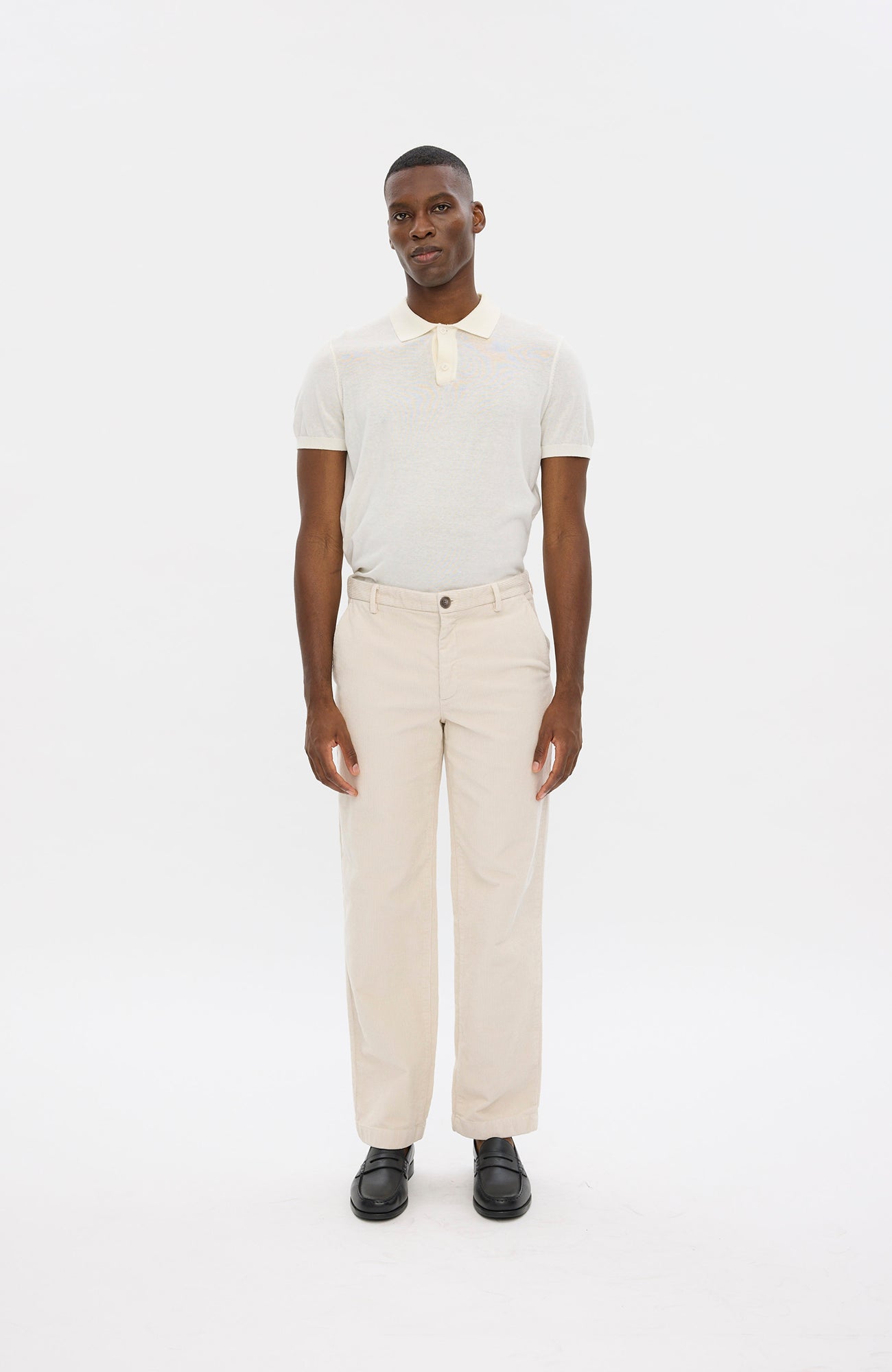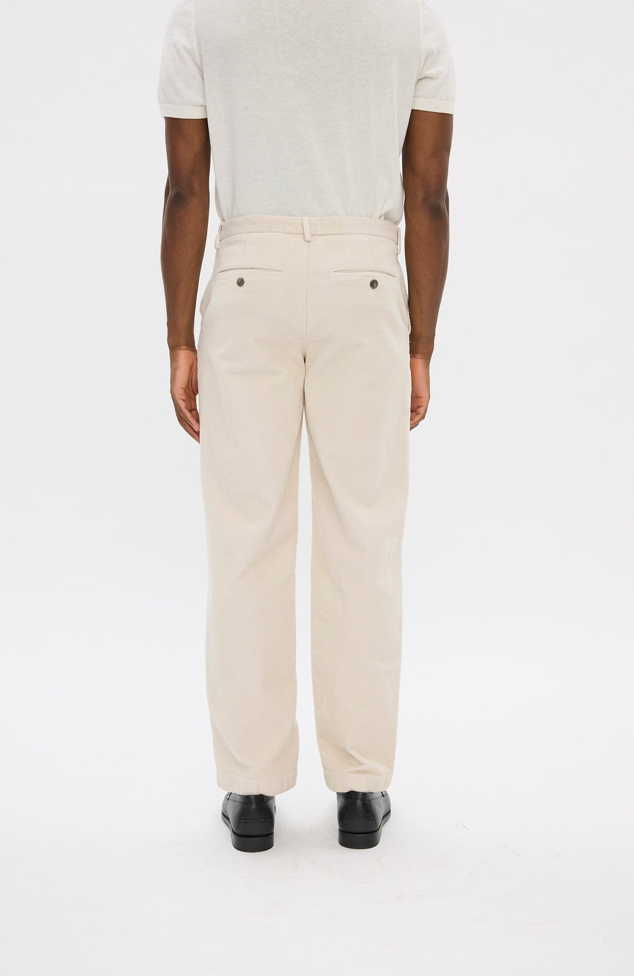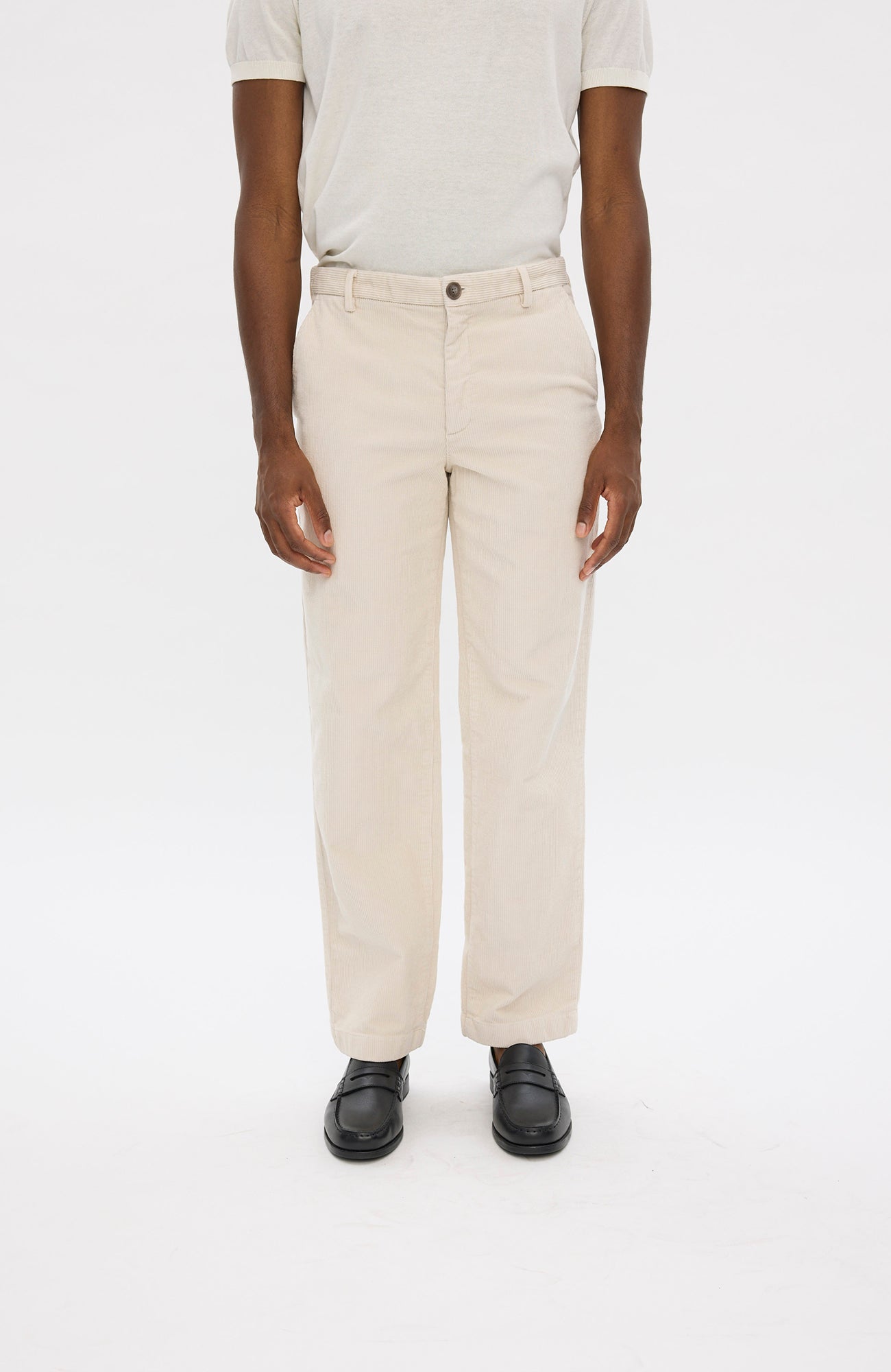 LucasPL er bukser med lige ben i tæt jernbanefløjl med et uformelt look. Denne enkle model har minimale detaljer med synlige syninger ved indersømmen og lommer samt paspolerede baglommer. Pasformen er lidt stor. Hvis du er mellem to størrelser, skal du vælge den mindste. Designet i København.