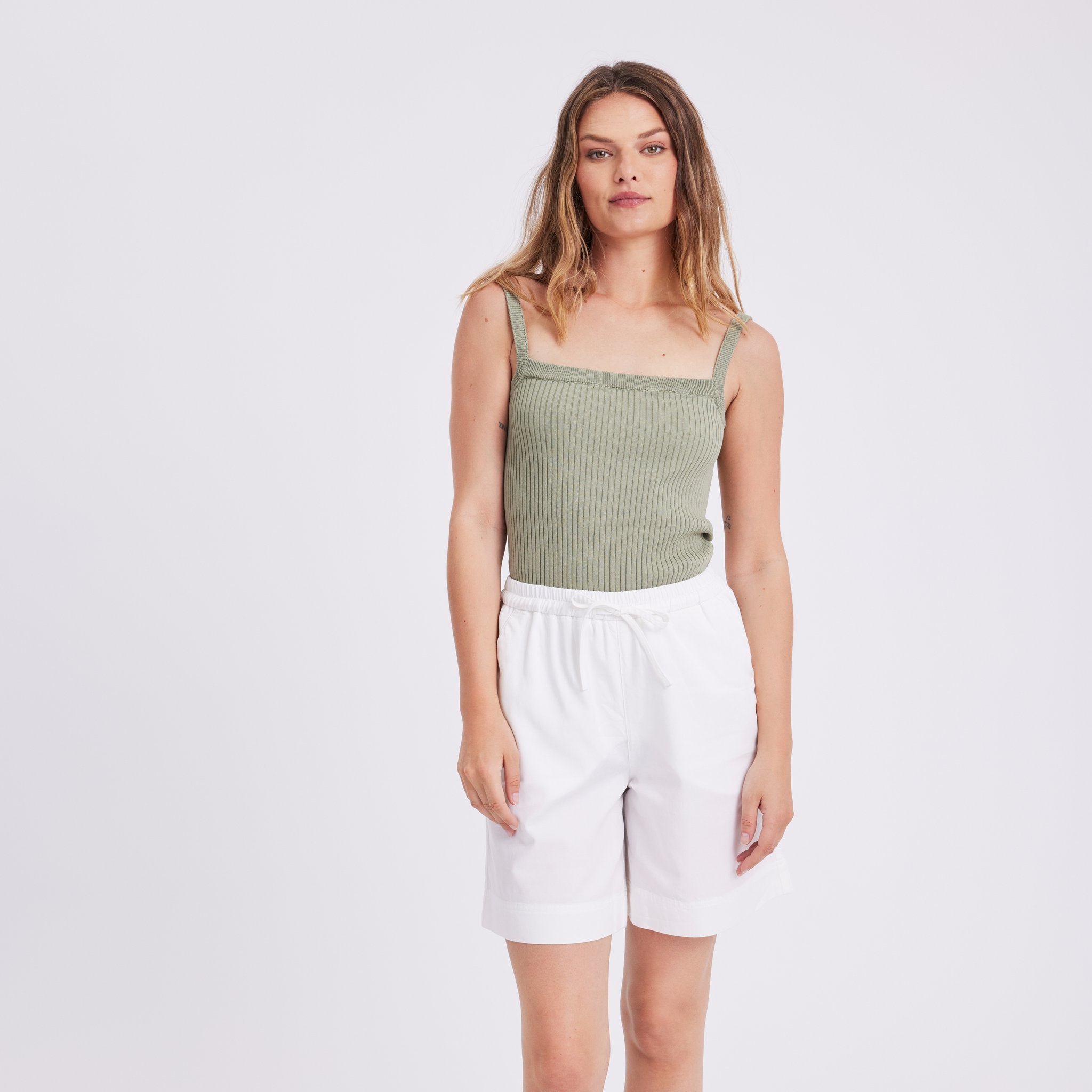 De mellemlange PaulaFV-shorts er afslappede, men elegante og har en fleksibel elastik i taljen med snøre, som gør dem nemme at trække på og justere, så de passer. Minimale detaljer omfatter praktiske skrålommer i siden. Designet i København og fremstillet af specia