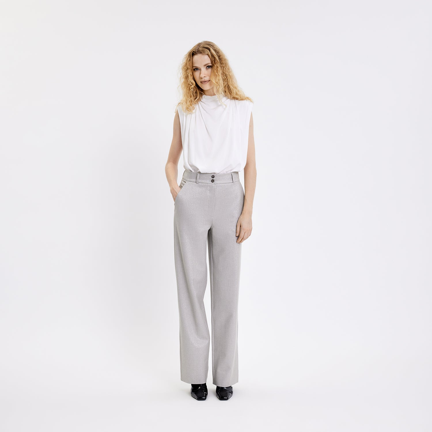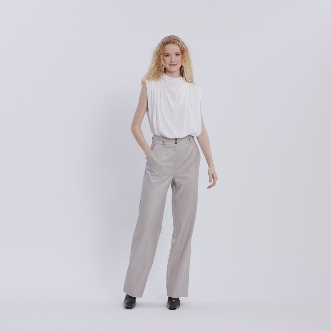 SophiaFV er bukser med en bred og lige pasform. Da de er højtaljede, er de formet til at sidde tæt på din talje og hofter. De har smukke, lige ben der falder elegant til jorden. Designet i København og lavet af specialister i Tyrkiet.