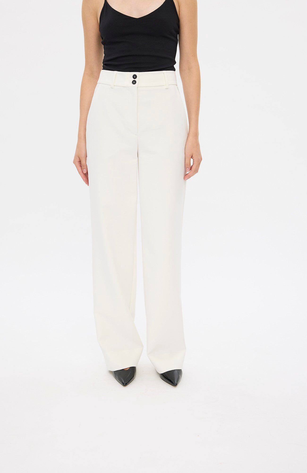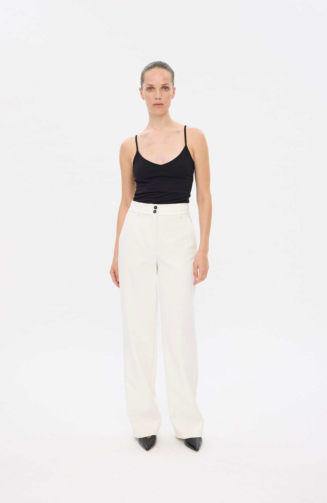 SophiaFV er bukser med bred, lige pasform. Da de har en høj talje, har vi formet dem, så de sidder tæt til din talje, hofter og intet andet. Deres smukke, flagrende ben sidder selvsikkert og elegant direkte ned i gulvet. Designet i København.