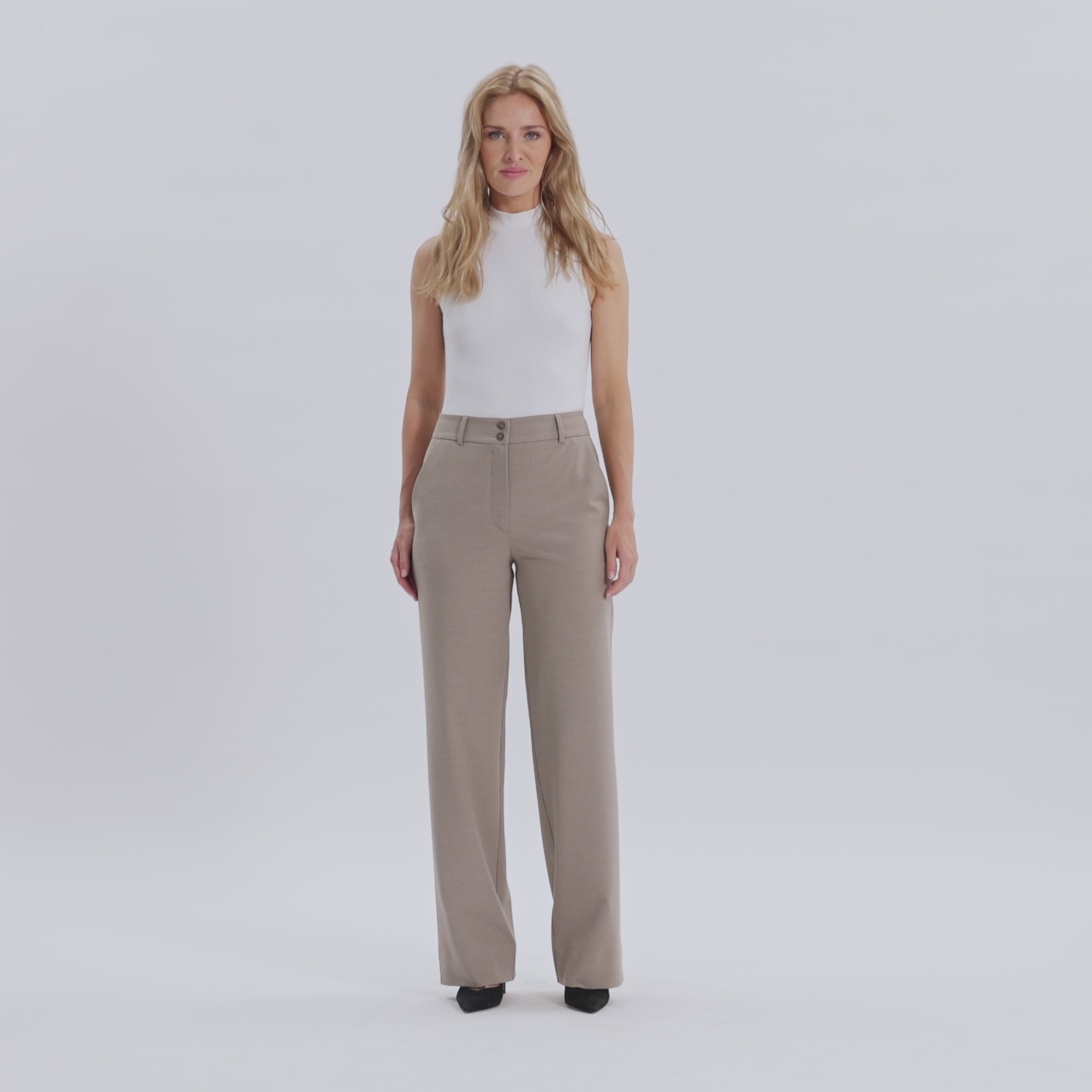 SophiaFV er bukser med en bred og lige pasform. Da de er højtaljede, er de formet til at sidde tæt på din talje og hofter. De har smukke, lige ben der falder elegant til jorden. Designet i København og lavet af specialister i Tyrkiet.
