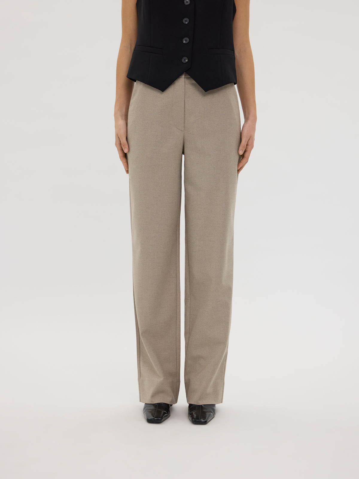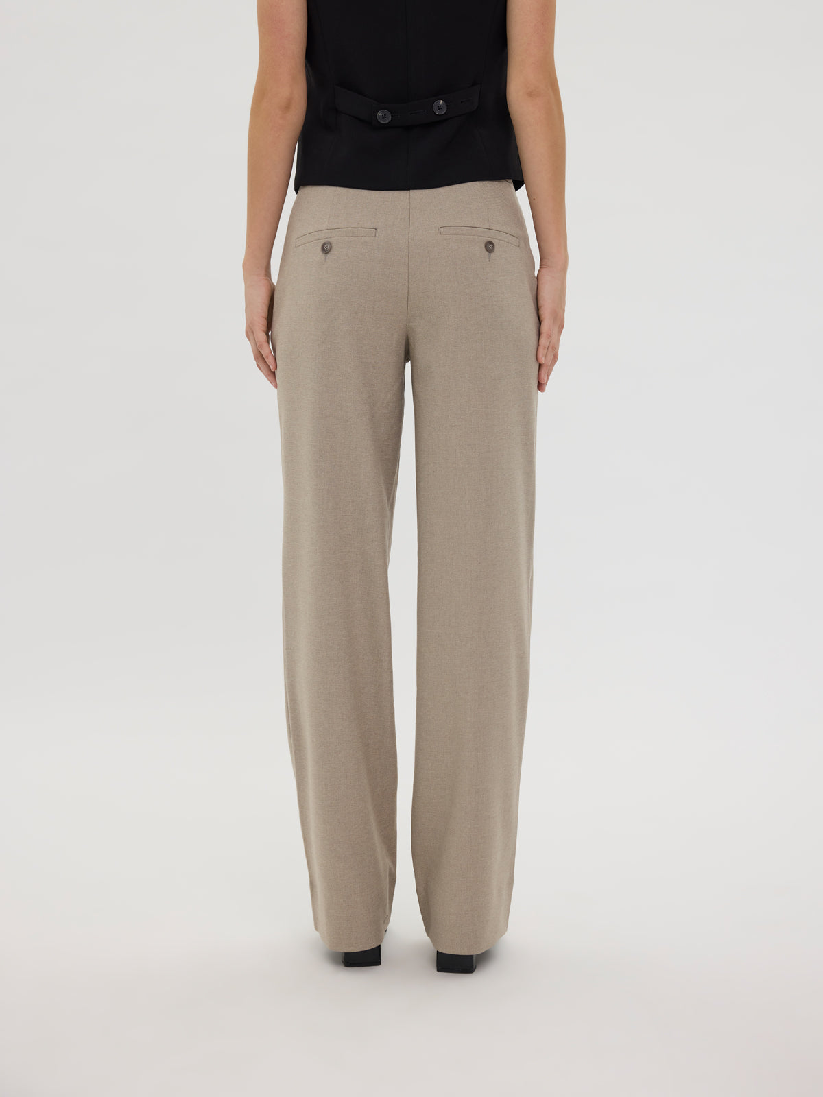 Sophia 438 er 'straight-fit’ bukser lavet af rigt twillvævet stof i et meleret design. En simpel konstruktion uden unødvendige detaljer understreger deres minimalistiske og tidløse stil. Bukserne har to skrå frontlommer, to dobbelt paspolerede baglommer, bæltestropper, knaplukning og lynlås. Designet i København og lavet af specialister i Tyrkiet.