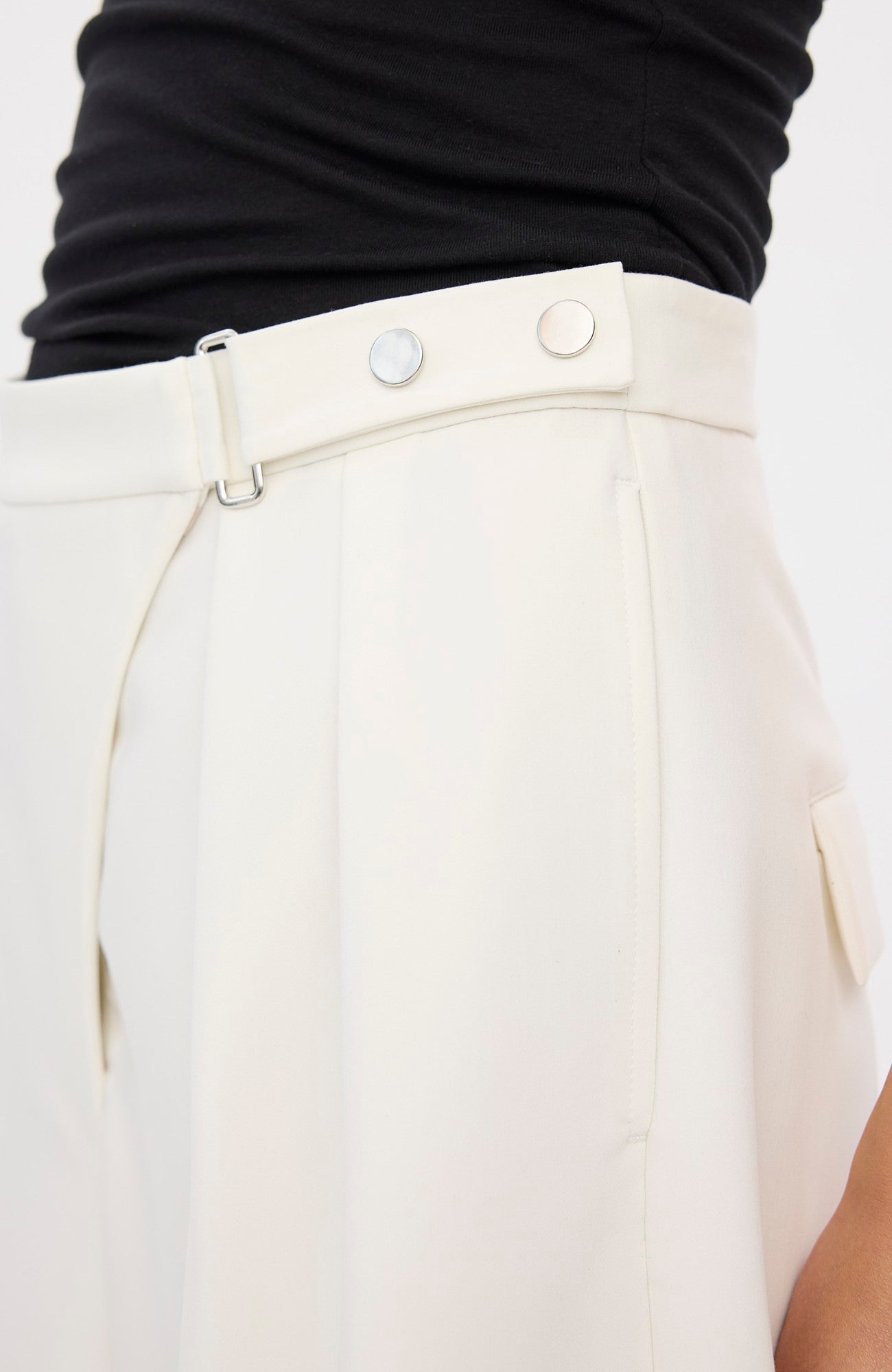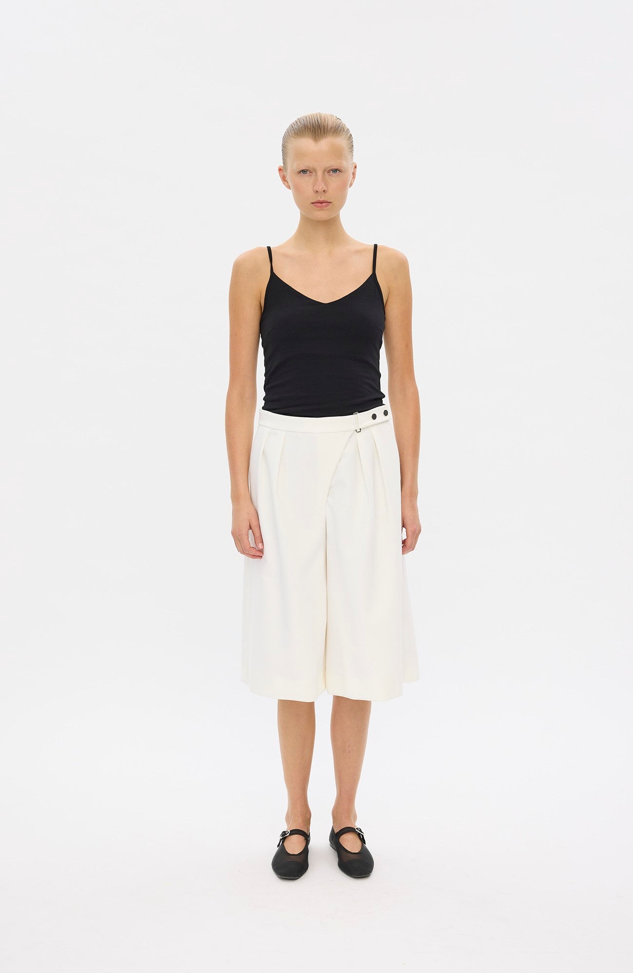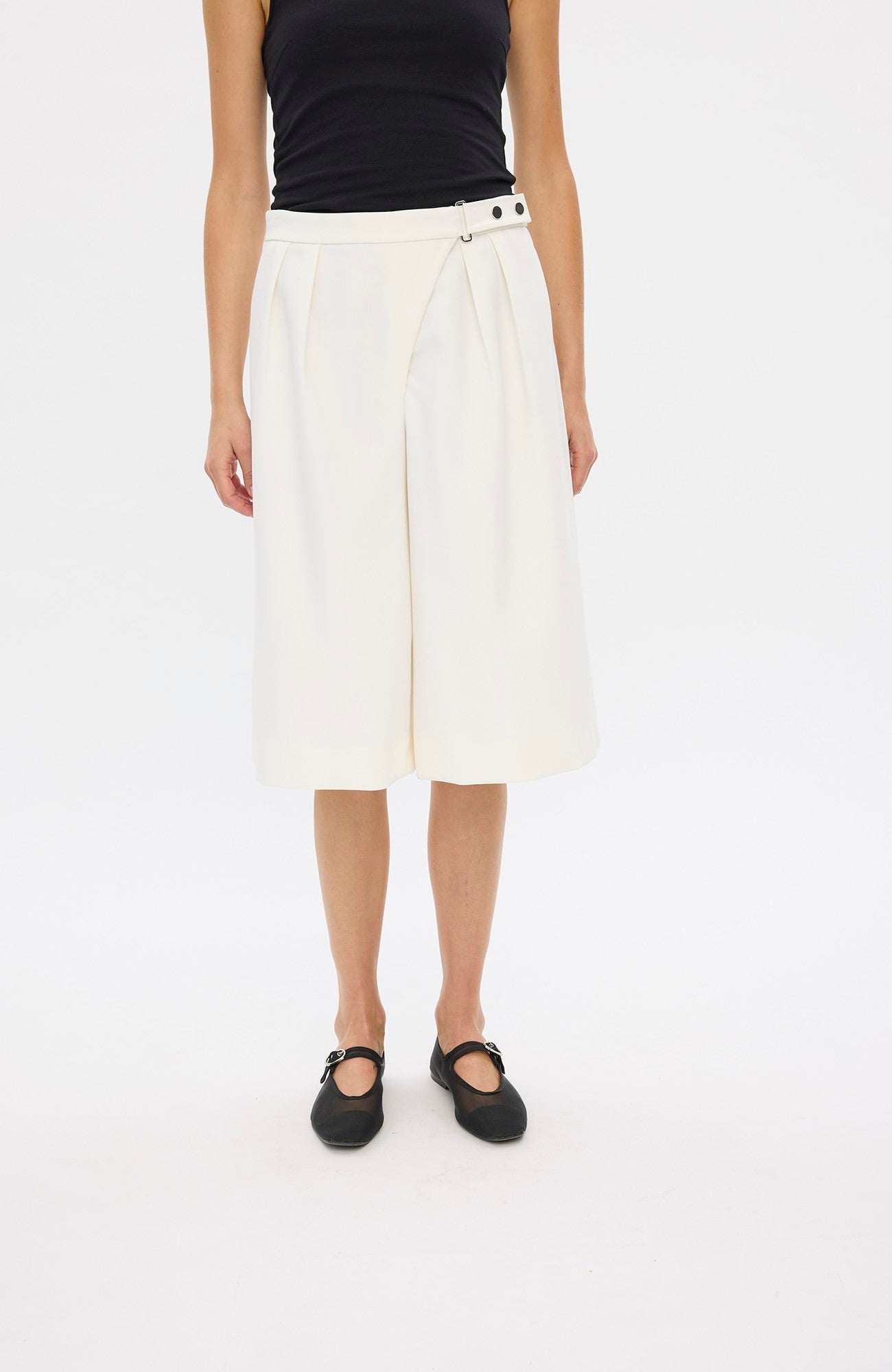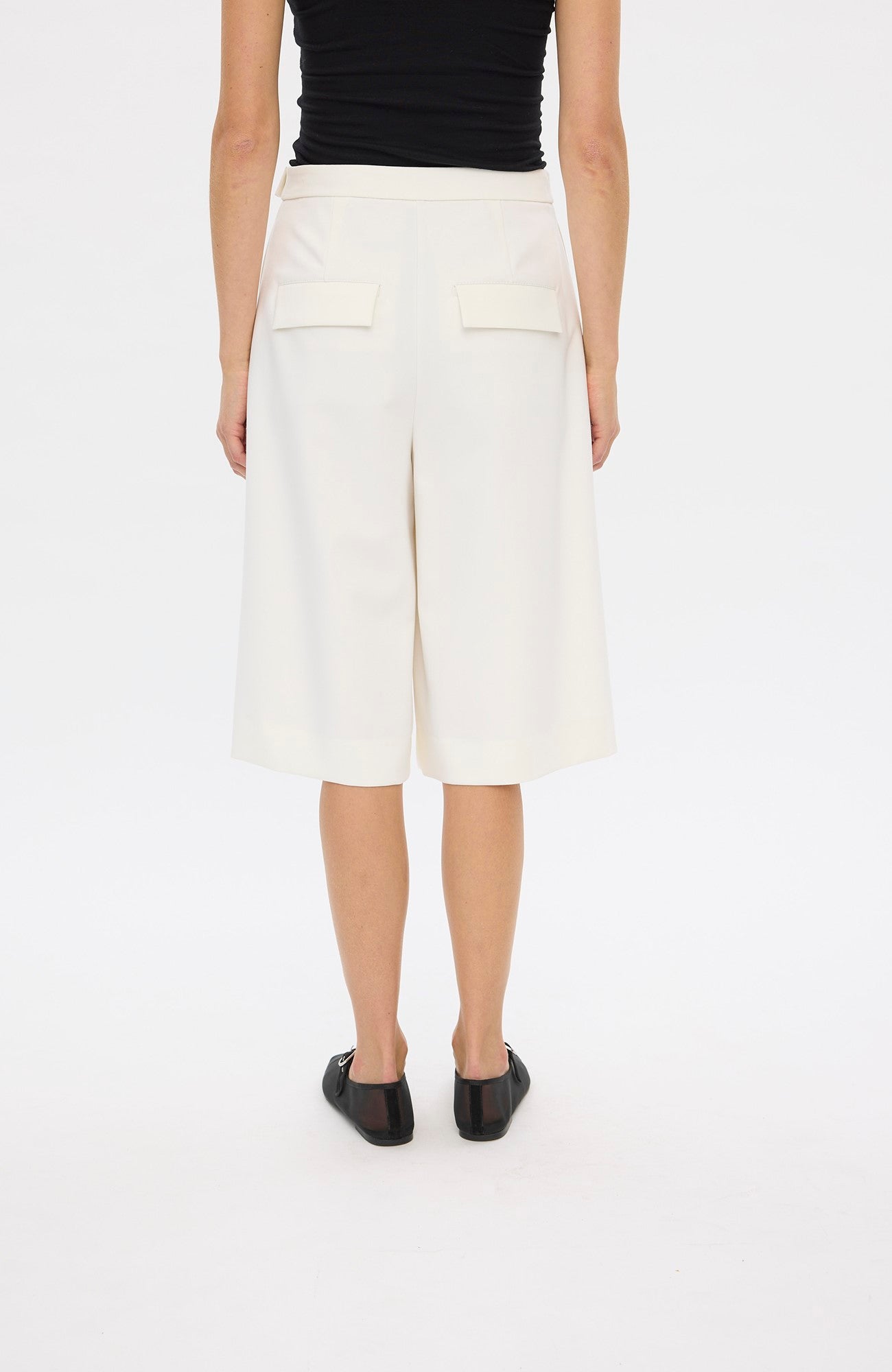 De vide ben og højtaljede UmaFV shorts har en asymmetrisk lukning foran, der sikres med et spænde, trykknapper og lynlåsgylp. De har funktionelle sidesømlommer og baglommer med klap. Forreste læg giver struktur og definition til silhuetten. Designet i København.